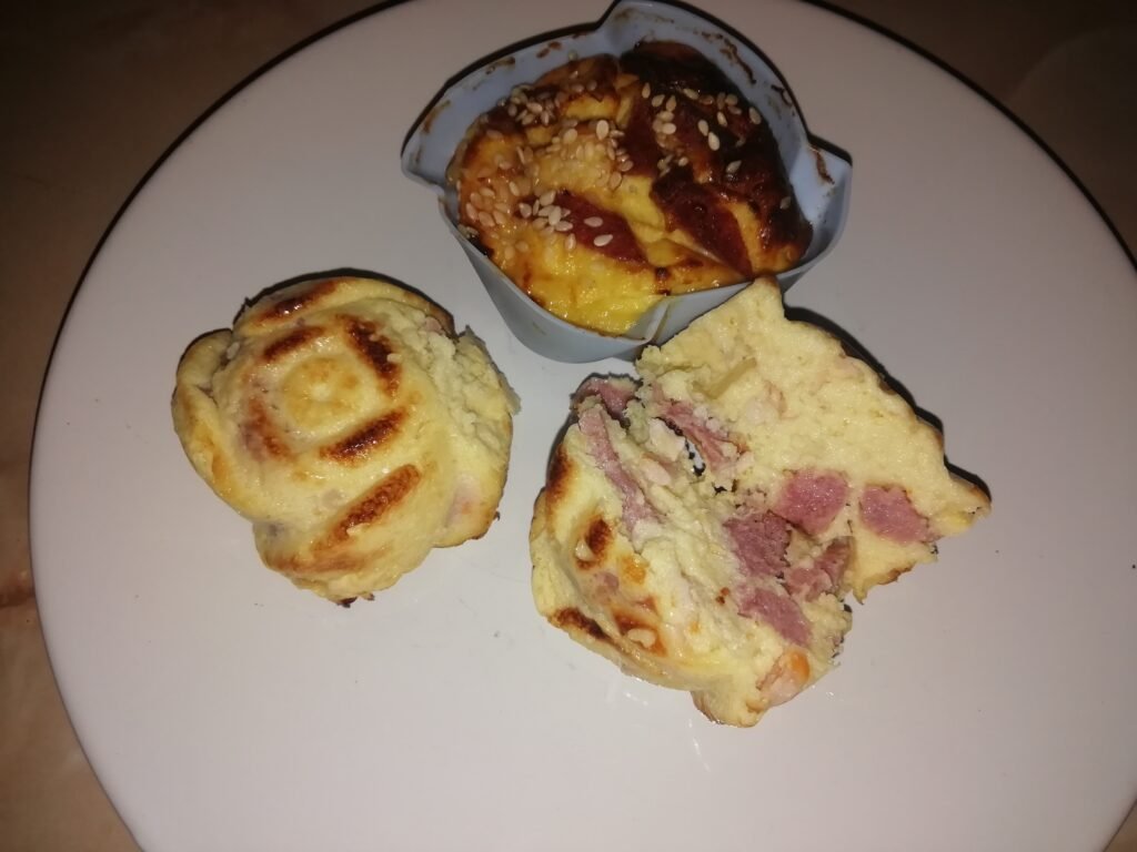 Mentiuni: 1. Pentru ca aceste briose sa fie si mai sanatoase, salamul se poate inlocui cu piept de pui (crud sau fiert) tocat cubulete sau cu un alt tip de carne ( peste, vita, porc etc). 2. Acest preparat poate fi gatit si in friteuza cu aer cald. Pofta buna!
