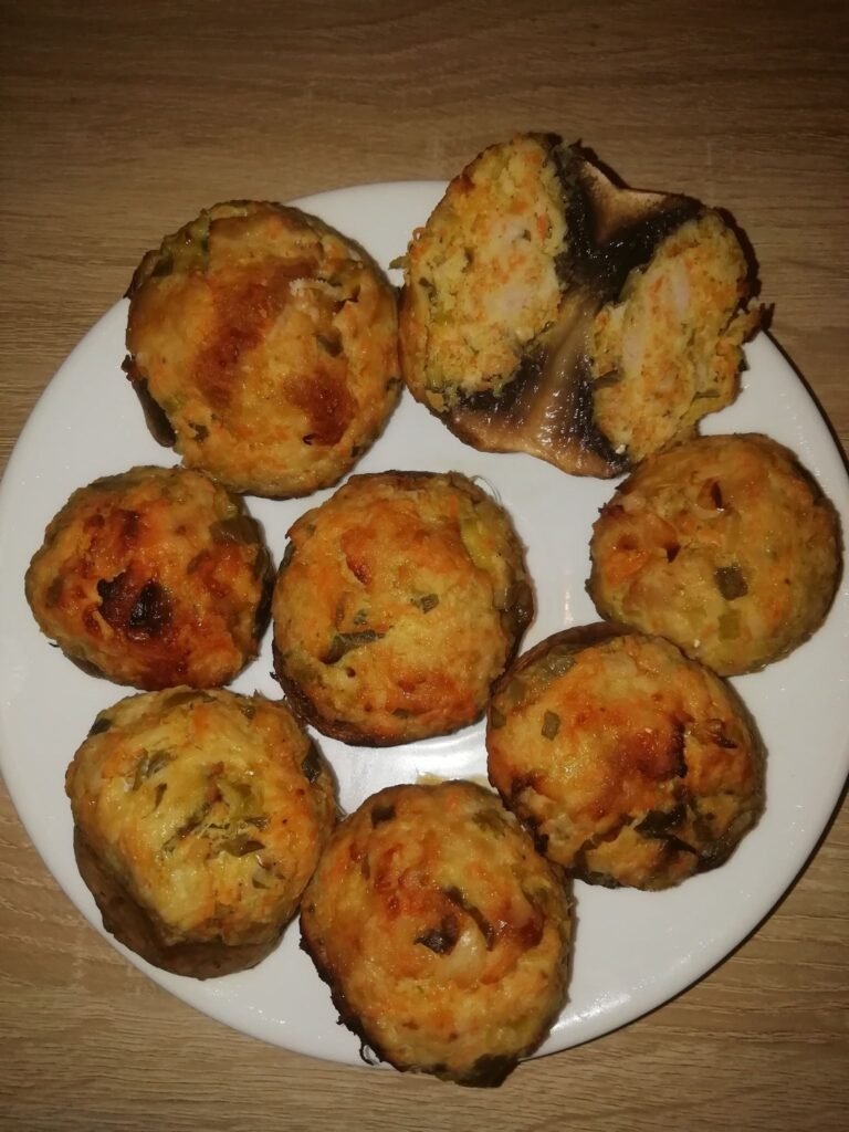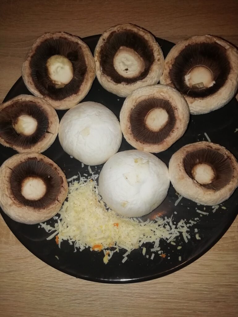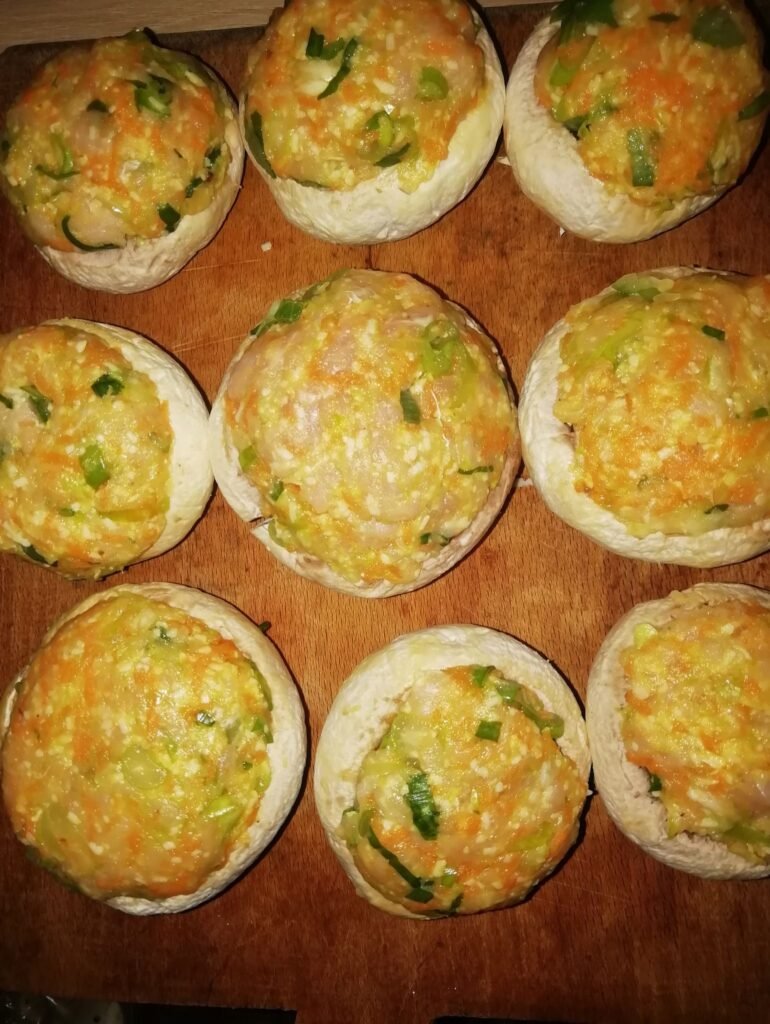 Mod de preparare: Am tocat cotletul de porc, dar puteți să folosiți carne gata tocată. Am ras fin un dovlecel, am presărat un vârf de linguriță de sare peste el și l-am lăsat deoparte câteva minute, timp în care am pisat usturoiul, am ras parmezanul și morcovul fin, am tocat mărunt ceapa verde; apoi, am pus dovlecel într-o strecurătoare și prin presare cu o lingură i-am scurs zeamă cât am putut de bine. Am amestecat cu o furculiță toate ingredientele și am umplut ciupercile cărora le-am îndepărtat pielița și piciorușele. Am așezat ciupercile într-o tavă și le-am lăsat la gătit în cuptor, cca 20-30 minute la 170-180 grade. Pe ciuperci puteți presară cașcaval sau parmezan ras și le mai lăsați 2-3 minute la gătit. Ca decor, eu adaug rondele de rosie!