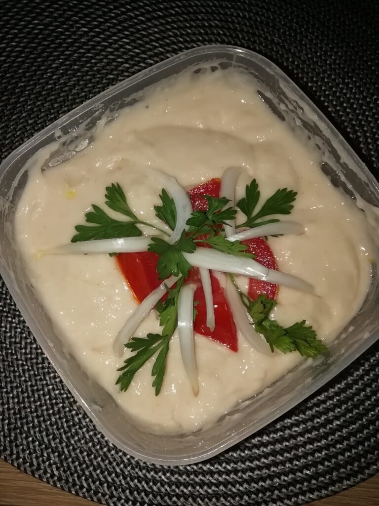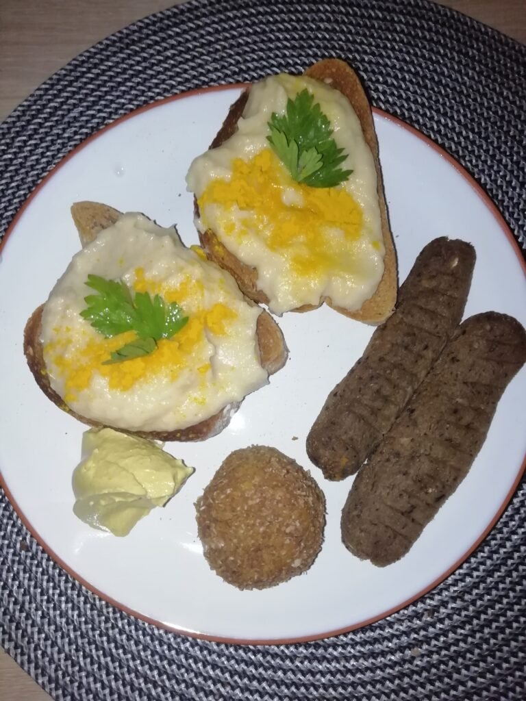 Am blenduit fasolea fiartă împreună cu ceapa și usturoiul, am adăugat sare, fulgii de drojdie și turmeric pudra. Am ornat după plac.