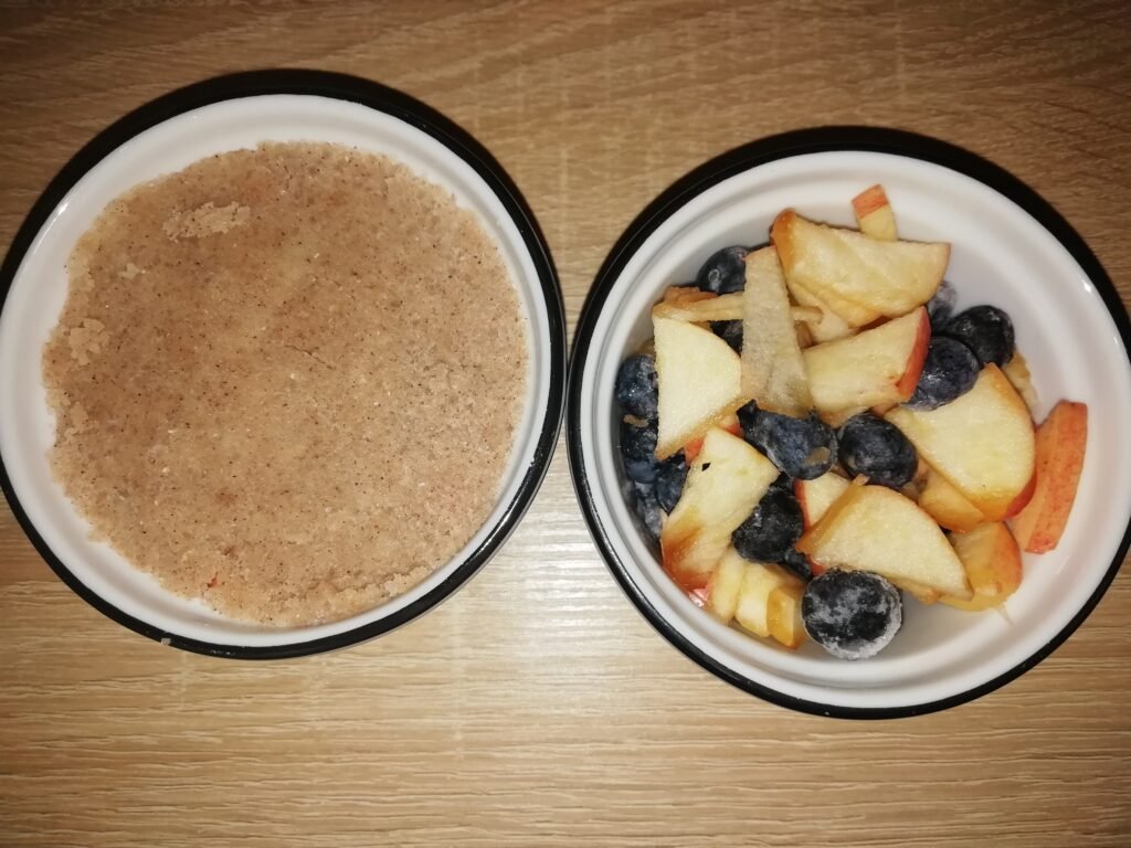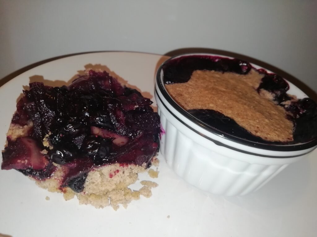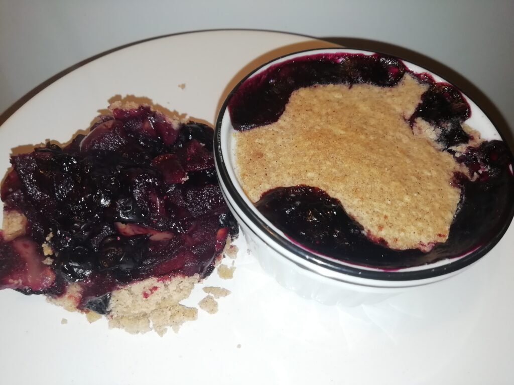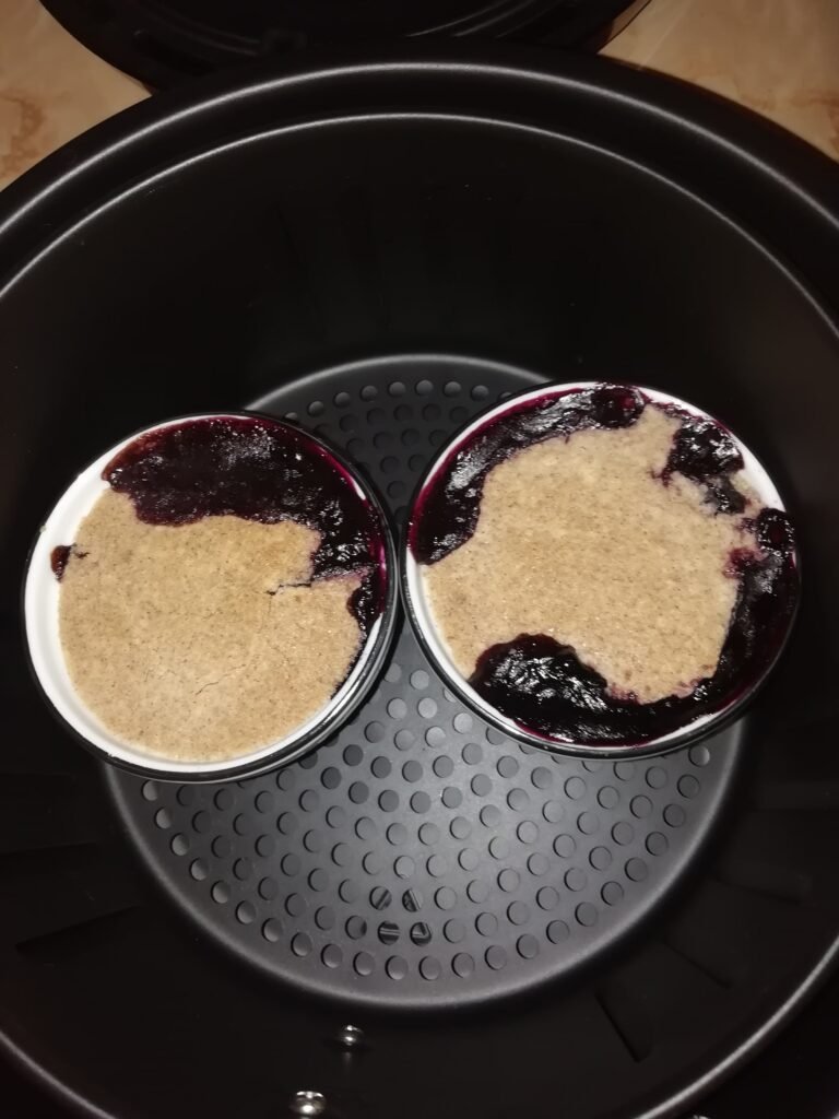 Mod de preparare: Marul l-am taiat cubulete si l-am amestecat cu afinele, iar aceasta combinatie de fructe a fost baza desertului. Peste stratul de fructe am adaugat faina pe care am amesteca-o cu indulcitorul, uleiul si scortisoara. Am obtinut 2 portii crumble, pe care le-am copt in friteuza cu aer cald cca 15- 20 minute.