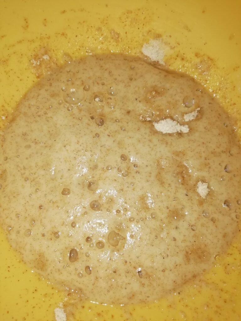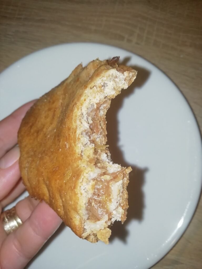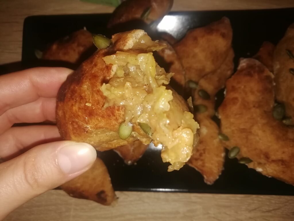 Mod de preparare: Am pregătit aluatul amestecand drojdia, faina, sarea, coaja de portocala cu indulcitorul dizolvat în apa; am adaugat uleiul si am framantat aluatul 1, 2 minute. Am lasat aluatul la dospit la temperatura camerei, pana si-a dublat volumul. Am ras merele și le-am scăzut vreo 15 minute la foc mic cat sa li se evapore surplusul de apa; am adăugat scortisoara; daca merele sunt acre puteti sa le indulciti dupa gust. Am impartit aluatul in 2 si am intins 2 foi din care am decupat 12 „morminte” :), ca sa fie in tema Hallowen-ul-ului (la momentul pregatirii acestei retete participam la un concurs tematic). Am pus cate o lingura de mar pe 6 dintre bucati si apoi peste fiecare am asezat cate o foie decupata tip mormant si am presat usor marginile cu degetele. Am copt desertul aproximativ 15-20 minute la 200 grade, pana s-a rumenit usor.