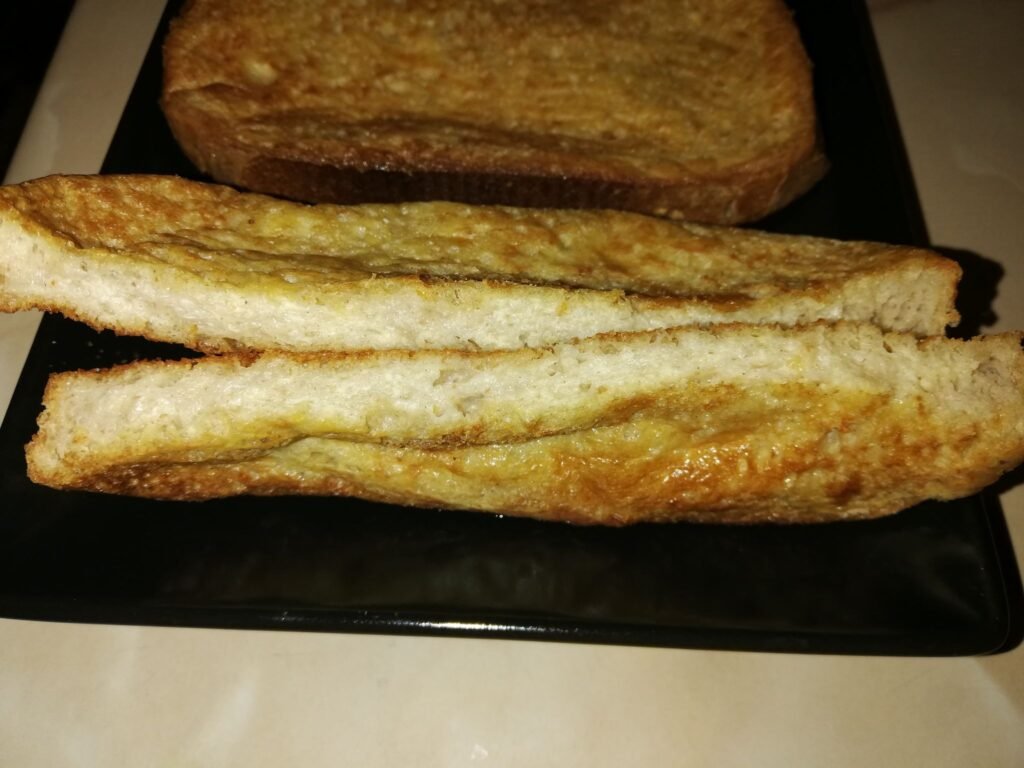 Mod de preparare:Am tapetat coșul friteuzei cu hârtie de copt -decupând un cerc așa cum vedeți în poză; am tăvălit feliile de pâine prin lapte, ou și le-am așezat la copt 5 min la 160 grade, apoi am înlăturat hârtia și le-am mai lăsat la copt cca 5-7 minute, pe cealaltă parte, la 180 de grade; vor fi crocante la exterior și pufoase la interior. Se pot găti și în cuptor.