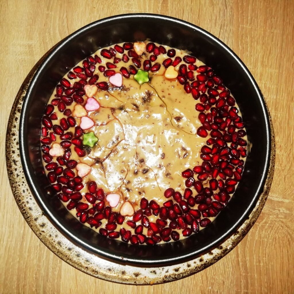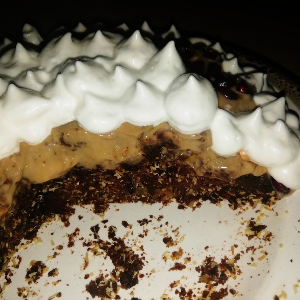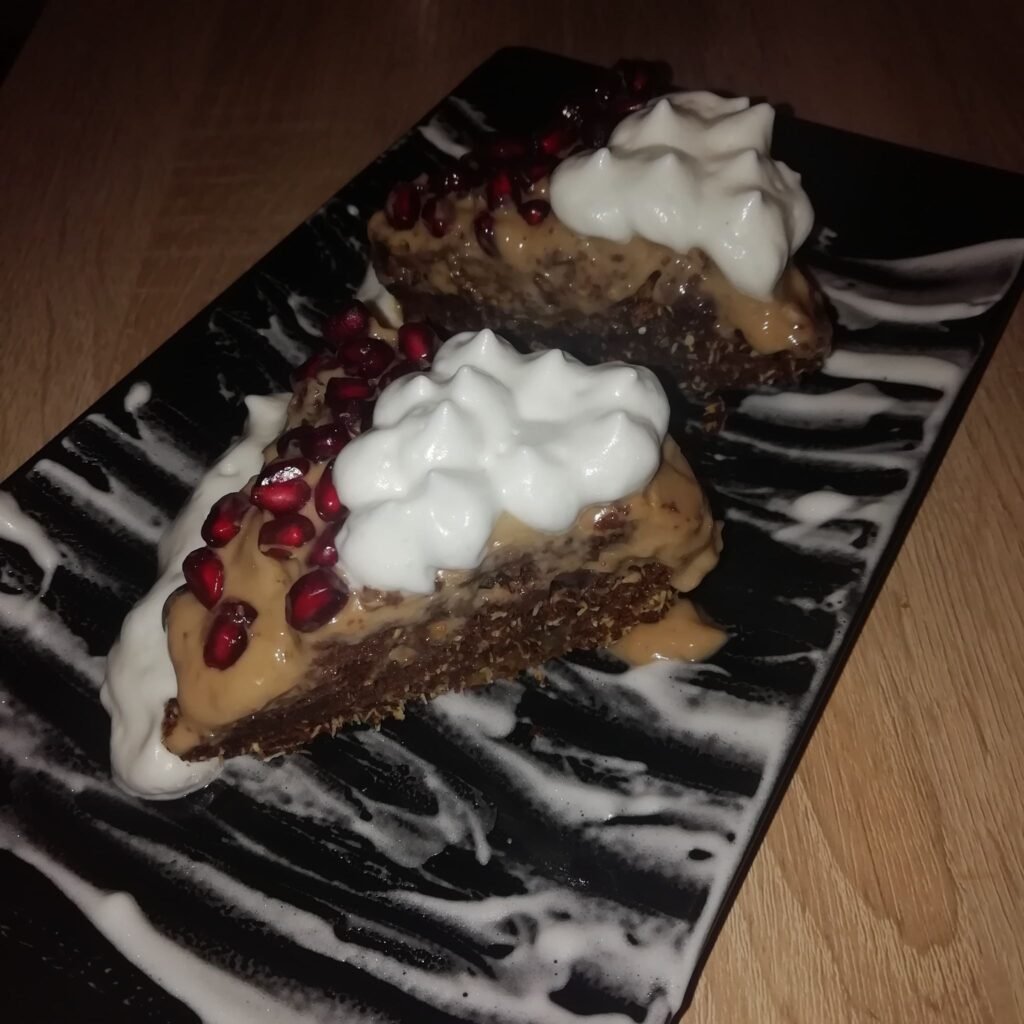 A fost delicioasă și frișcă și tortul care a fost pregătit ad-hoc; vă las rețeta, rapid, aici: blat– din cca 450-500 g chec sfaramitat pulverizat cu puțin lapte de migdale și presat cu o lingură pe o farfurie, ajutându-mă de inelul unei tavi rodunde de 18 cm; crema fiartă- cca 5 minute și obținută din 350 ml lapte de migdale, 1 plic cafea 3 în 1, îndulcitor din ștevie după gust, 35 g amidon, 1/2 linguriță agar-agar; in crema am încorporat 50 g crema de alune și am mixat-o scurt. Am distribuit crema peste blat, am decorat tortul cu bobițe de rodie; desertul, inainte de a fi portionat trebuie lăsat la frigider până observați că se întărește crema- măcar 30min; eu nu am avut răbdare, căci tocmai pregătisem acestă frișcă- spumă de aquafaba.