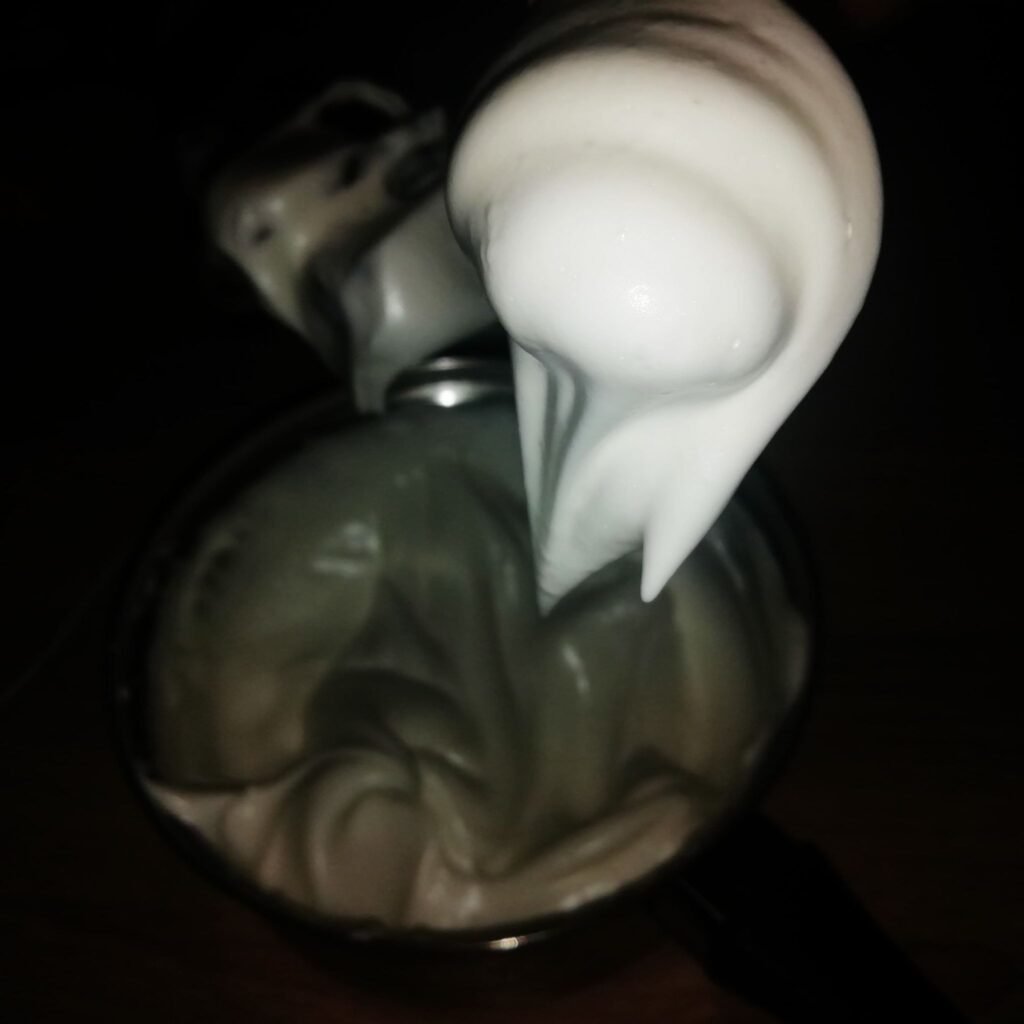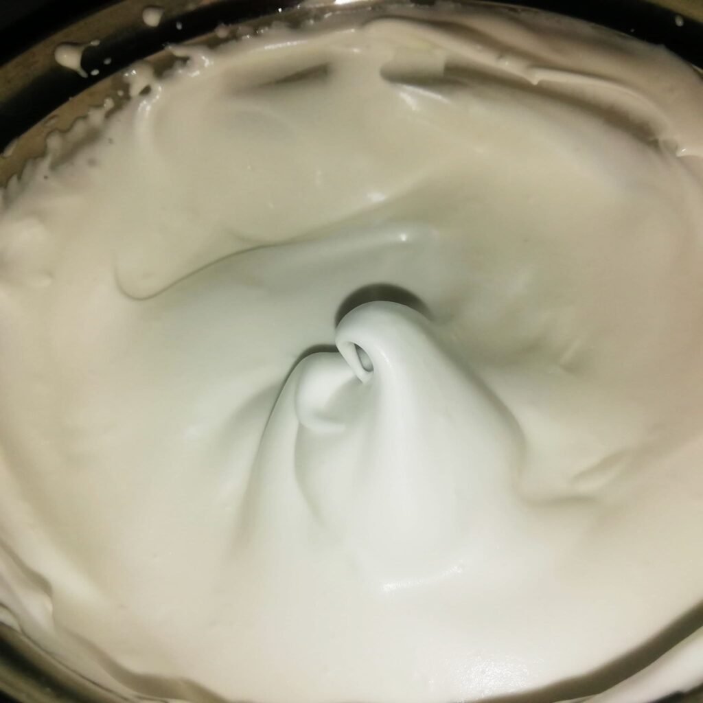 Mod de preparare: Am pus lichidul dintr-o conservă de năut la fiert cca 4,5 minute la foc mediu până am obținut reducția concentrată de aquafaba, adică cca 170-180 ml lichid l-am redus la cca 90 ml. Am lăsat acest lichid vâscos-gelatinos la frigider până la răcirea să completă și apoi l-am mixat cca 2, 3 minute la viteză maximă. Am adăugat indulcitorul pudra și am mai mixat cca 4,5 minute până la topirea integrală a indulcitorului. Am adăugat apoi, 2, 3 picături din esență preferată și am mai mixat scurt câteva secunde (esență de lămâie mi se pare că se potrivește cel mai bine cu afeter testul fresh al indulcitorului din ștevie). Am pus un posh într-un pahar cu pereții cât mai înalți și am pus 3, 4 linguri din frișcă apoi am decorat rapid un tort pe care nici nu am mai avut răbdare să îl las la rece cât ar fi trebuit.