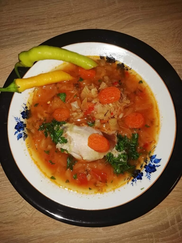 Mod de preparare: Am fiert cotletul de porc în apă (cât să îl cuprindă) cu un vârf de cuțit de sare și 2 foi dafin aproximativ 30 minute. Apoi am strecurat supă obținută pentru a îndepărta urmele de spumă de carne și am adăugat varză tocată și orezul clătit în 2 ape. Am lăsat mâncarea la fiert aproximativ 20-30 minute apoi am adugat morcovul ras fin, roșiile tocate cubulețe, ceapă tocată (puteți folosi ceapă albă sau chiar roșie dacă va place și nu aveți ceapă verde la dispoziție). Dacă doriți că mâncarea să fie ușor acrișoară puteți adaugă, după gust 1,2 linguri de oțet sau un pahar cu borș. Mâncarea a mai fiert la foc mic încă 5-7 minute apoi am adăugat mărarul proaspăt, tocat, și am condimentat după gust cu sare, piper negru boabe, usturoi pisat și opțional, dacă doriți puteți adaugă o linguriță de boia dulce sau bulion pentru a obține o mâncare mai colorată! Am mai atașat încă o varianta a acestei rețete, gătită altă dată cu carne de pui. O puteți pregăti mai scăzută sau mai zemoasă după plac; ajustarea cantității de zeamă o puteți face prin adăugarea de apă sau supă de pui/de legume în momentul în care adăugați legumele sau chiar spre finalul timpului de gătire, atunci când o condimentați după gust cu sare și alte verdețuri. Poftă mare!