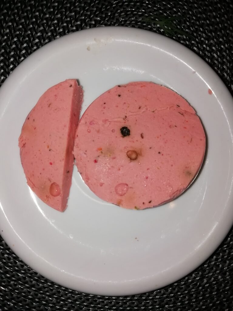 Mod de preparare: Am fiert pieptul de pui în apă cu o foaie de dafin și un vârf de linguriță de sare și apoi l-am tocat cu ajutorul unui blender de mâna (se poate folosi mașina de tocat carne). Am adăugat usturoiul pisat, sucul de sfeclă, gelatină hidratata potrivit instrucțiunilor de pe plic și am condimentat după gust cu sare, boia, piper negru și busuioc. Am transferat pastă obținută într-o sticlă de plastic și am lăsat-o peste noapte la frigider.
