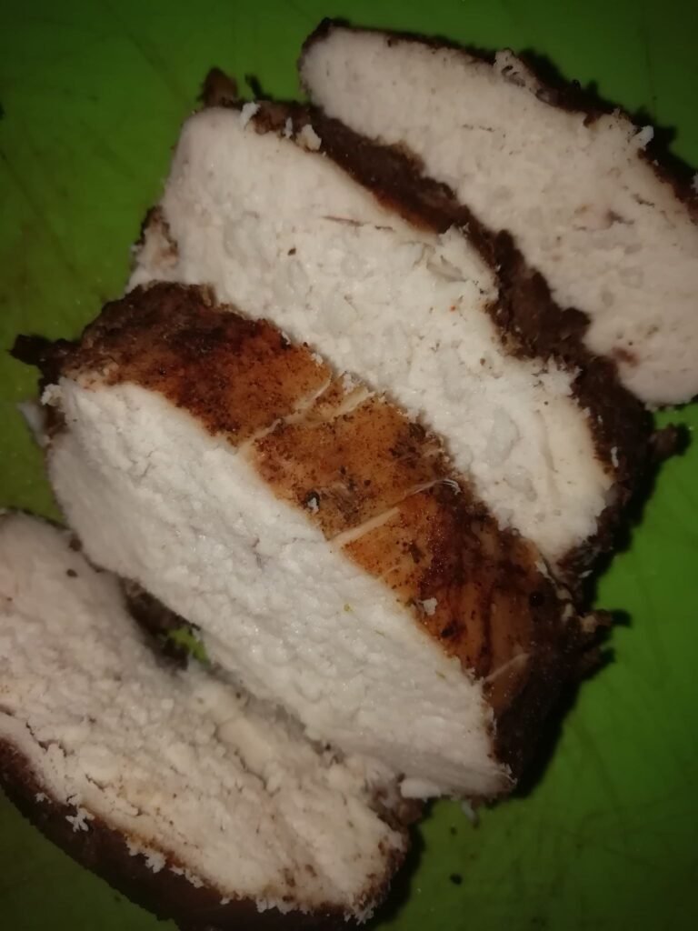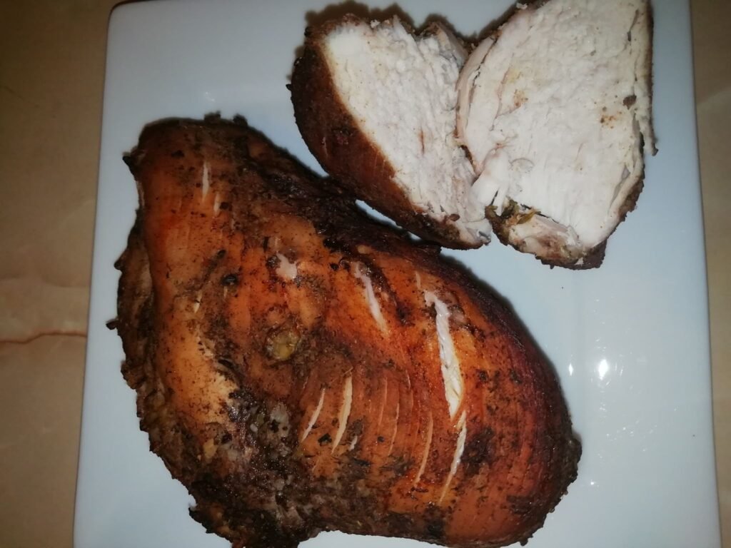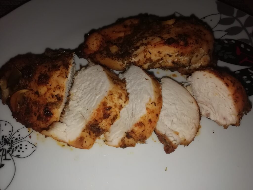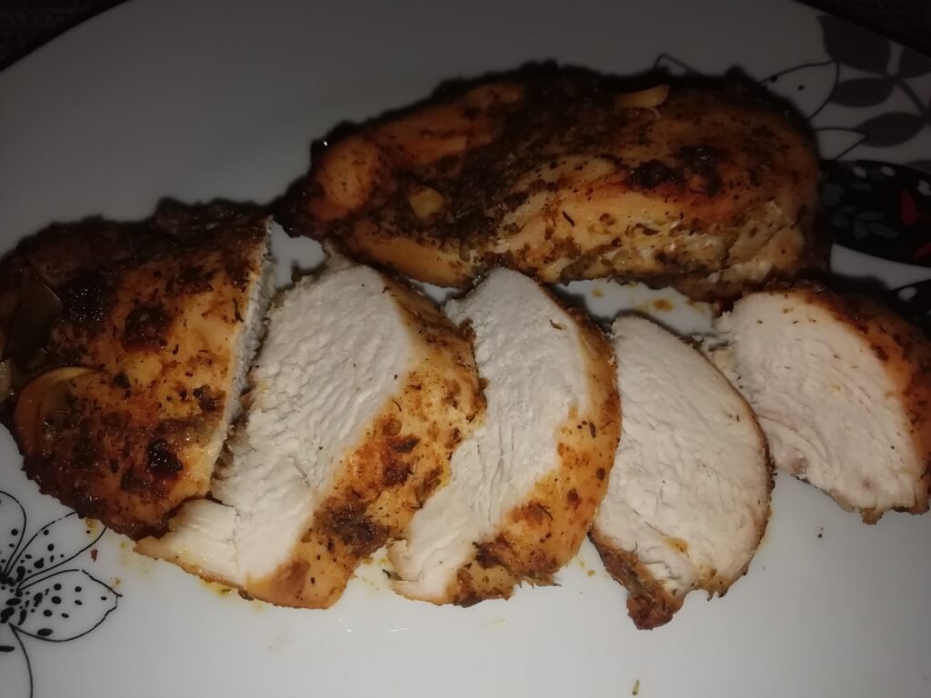 Mod de preparare: Am pregătit marinada pentru pieptul de pui, astfel: în 100 ml apă rece am adăugat sare, piper, usturoi și foile de dafin rupte bucățele și am lăsat pieptul de pui la marinat 12 ore (am ales să-l las peste noapte în frigider într-un vas acoperit). Am pregătit sosul cu care am uns pieptul de pui astfel: am amestecat untul topit cu mierea, oregano și boiaua de ardei dulce. Am pus pieptul de pui într-un vas cu 5 linguri din marinadă, l-am acoperit cu un capac (folie de aluminiu) și l-am băgat în cuptor pentru 20-25 min la 180 grade apoi am înlăturat capacul și am lăsat să se rumenească încă 20 min la 200 grade. Poftă bună!