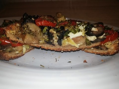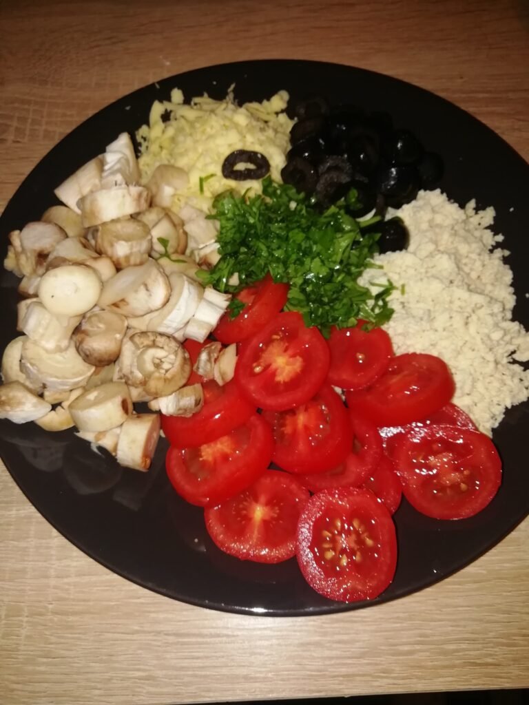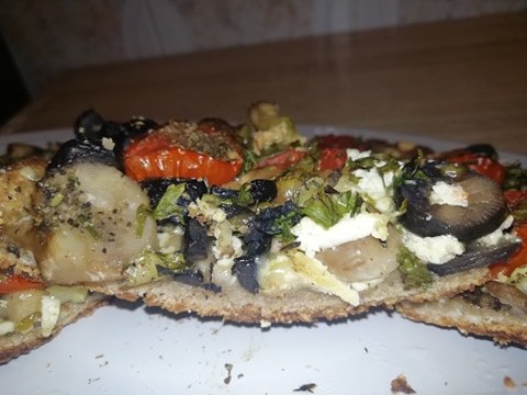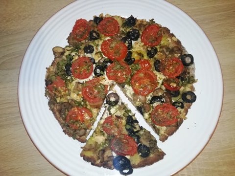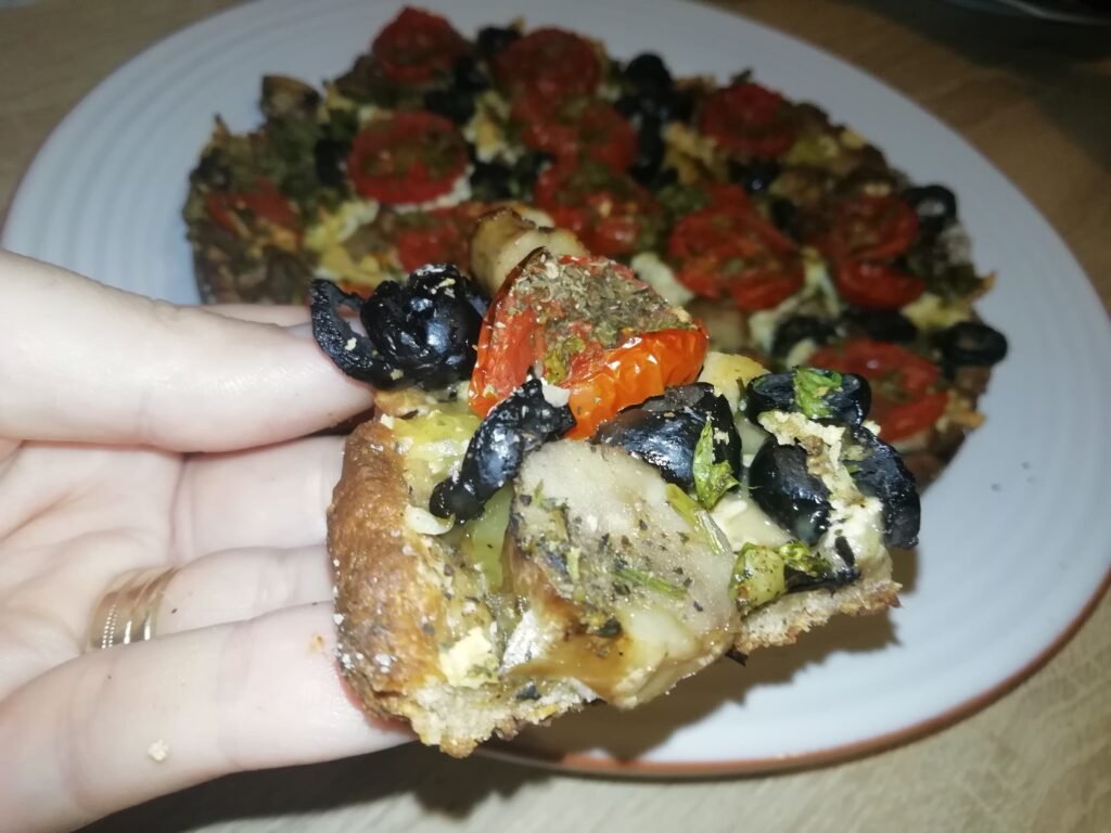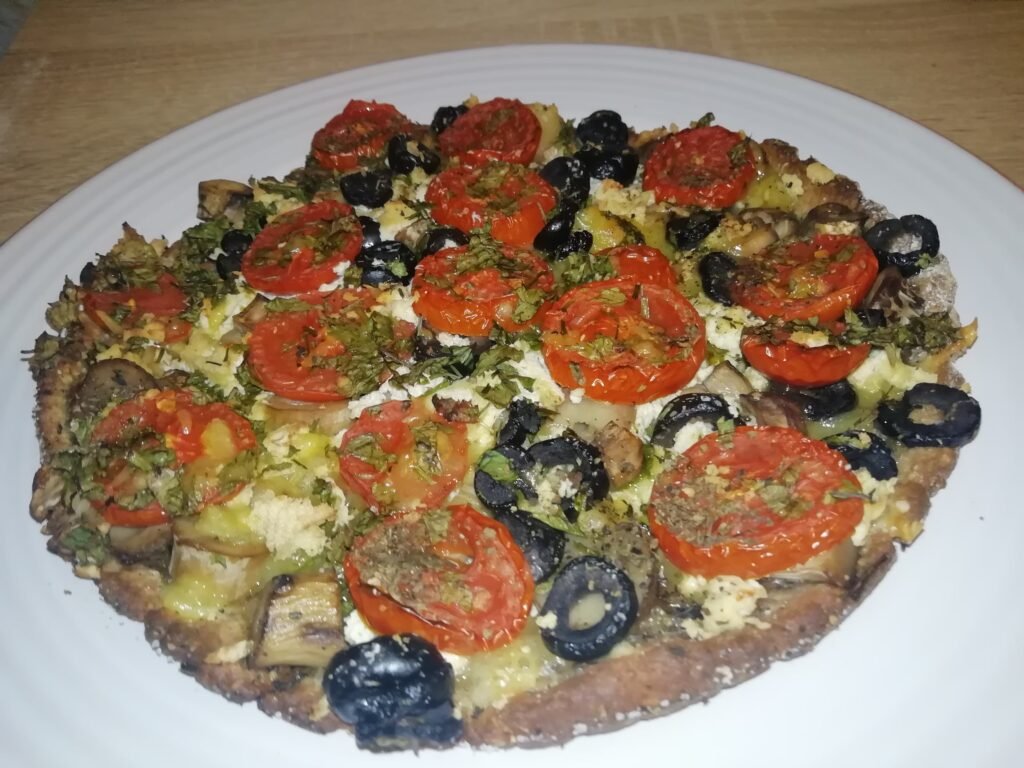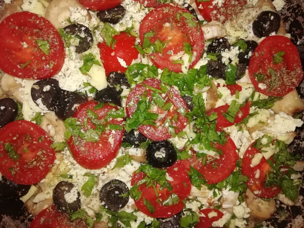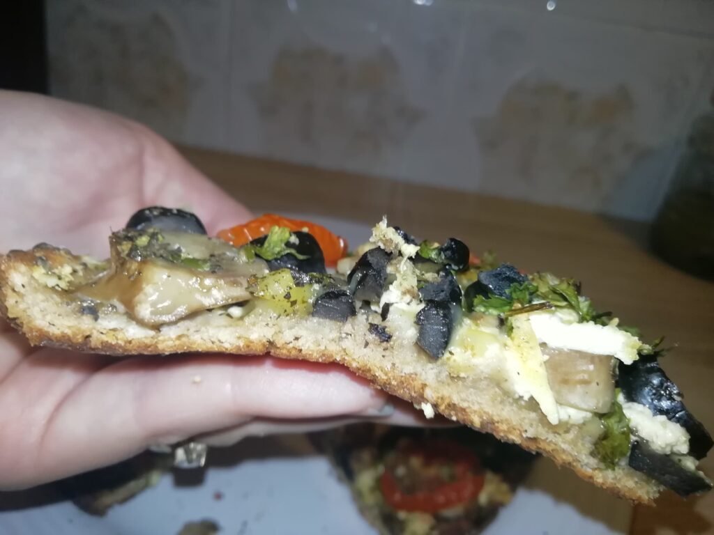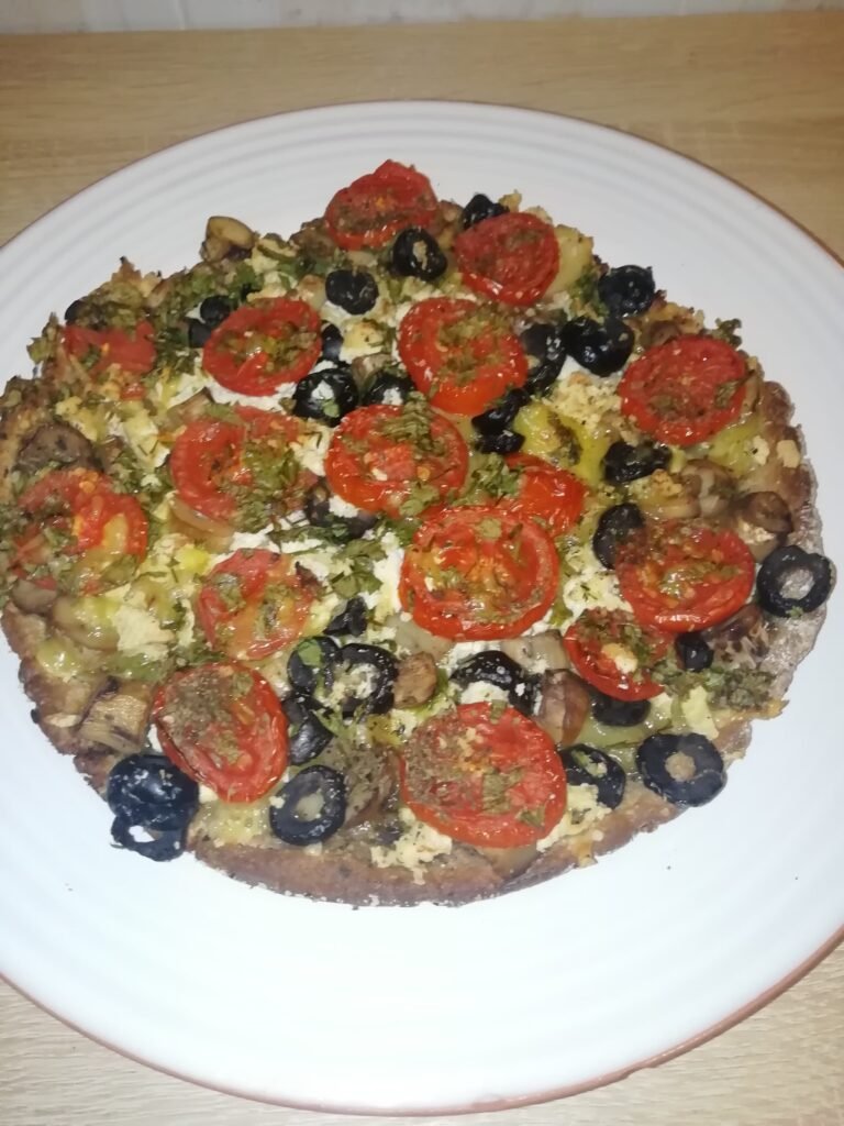 Mod de preparare: Am pregătit maiaua: am amestecat drojdia împreună cu îndulcitorul, 2 linguri din faina de secara și cu 2 linguri de apa (20 g); am lasat-o lăsat-o cca. 20-30 minute la dospit, ca să își dubleze volumul; apoi am adăugat fulgii de ovăz, un praf de sare și apa, lăsând cca 2,3 minute fulgii la hidratat apoi i-am pisat/sfărâmat puțin cu o furculița. Am incorporat restul de faina, oprind 1 lingura pentru înfainat blatul de lucru. Cu ajutorul unei linguri de ulei (folosiți de care doriți) am înlăturat aluatul de pe mana și dacă doriți și aveți timp îl puteți lasă în bucătarie acoperit cu un prosop cca 1,2 ore ca să își dubleze volumul. Eu nu am avut timp de aștepatare, asa ca imediat am presărat pe blatul de lucru faina oprita adineauri și cu un facalet (sau se pot folosi doar mâinile) am întins blatul de pizza de maxim 1 cm grosime. Am presărat pe blat puțin busuioc și oregano uscat, apoi, brânză tofu pasata cu furculița, 1/3 din cașcavalul ras (restul l-am amestecat cu ciupercile ca să se fixeze mai bine de blat), ciupercile tocate (codite am folosit eu), maslinele feliate, pătrunjelul tocat, un praf de sare la final, peste legume. Am lăsat pizza la copt cca 15 min la programul coacere sus și jos la 200 grade apoi încă cca 10-15 min la cel cu coacere de jos, tot la vreo 200 grade.