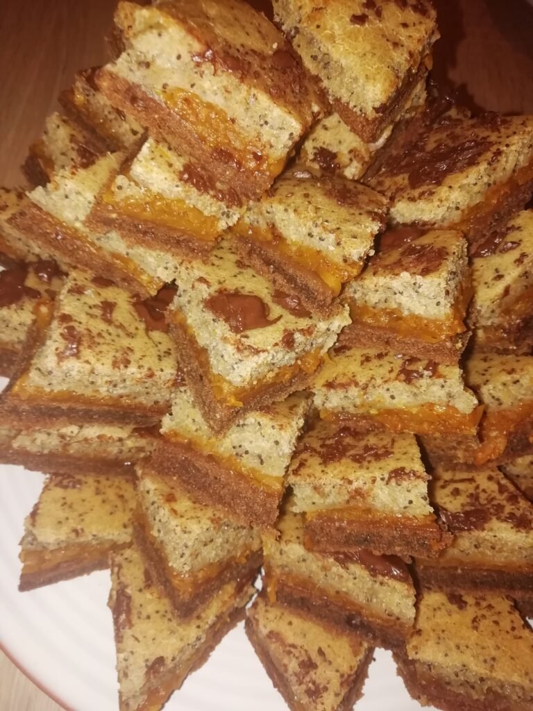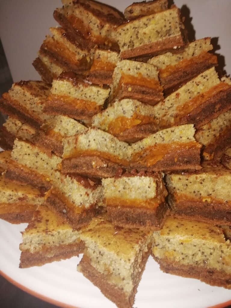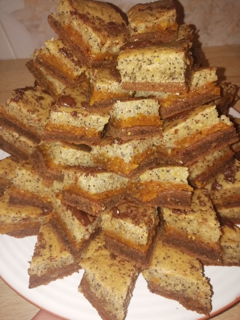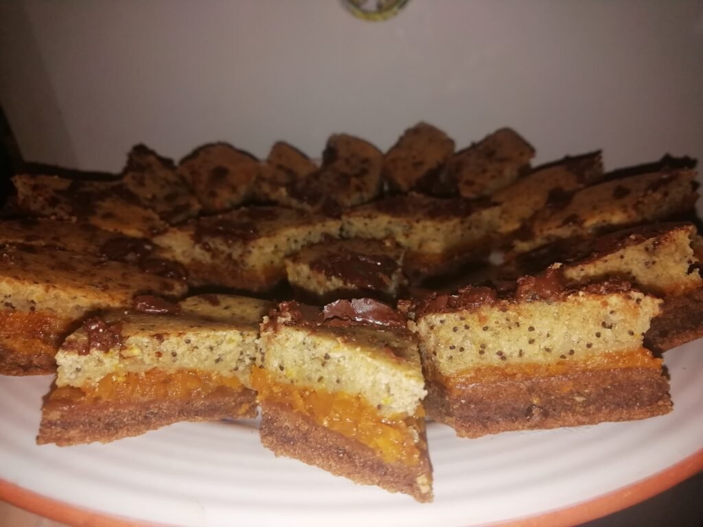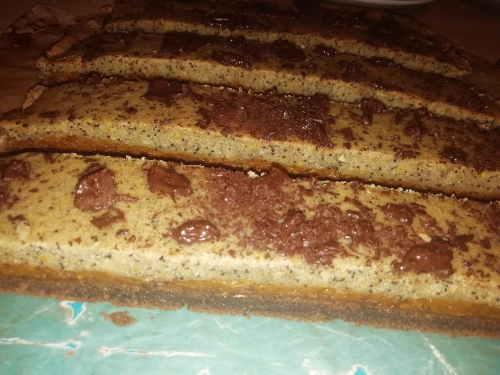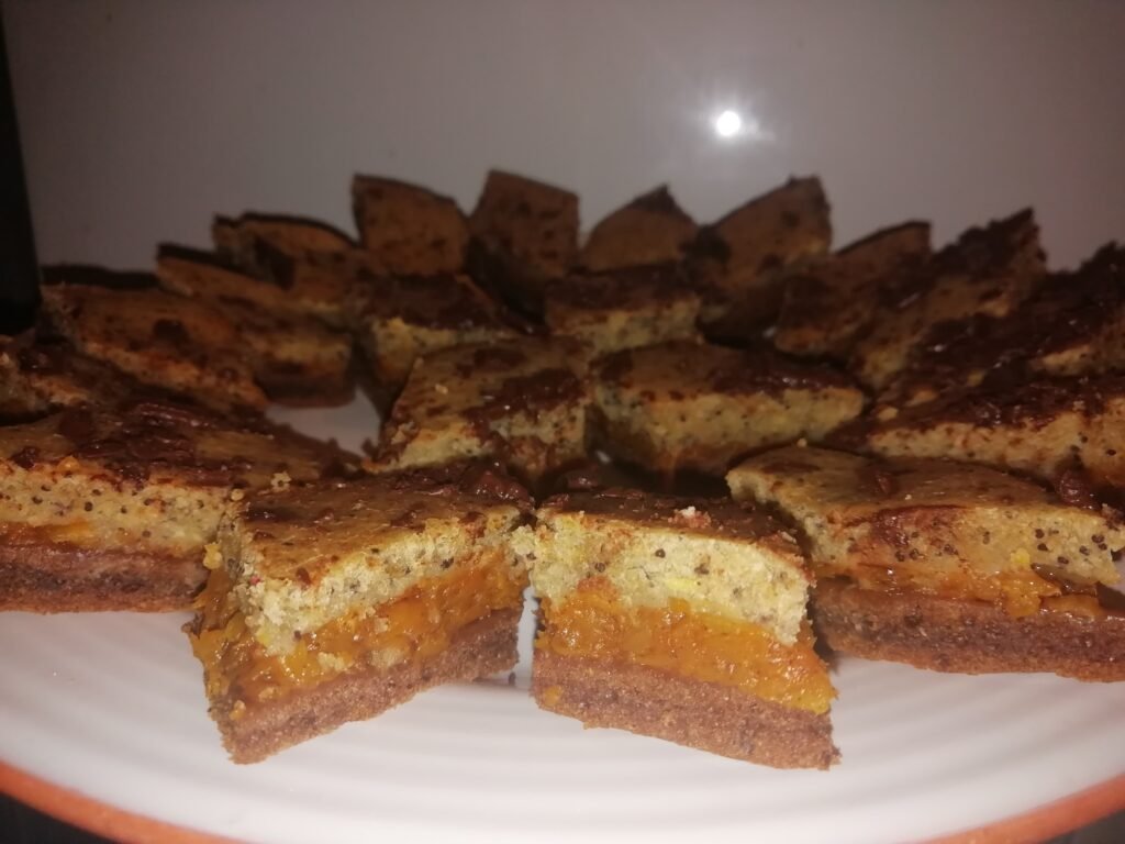 Cum am pregătit compoziția pentru blat: Am amestecat făina cu praful de copt nestins, am presărat un praf de sare și apoi am adăugat: apa minerală, uleiul, îndulcitorul, esența, coaja de portocale răzuită fin. Am mixat compoziția câteva secunde, apoi am împărțit-o ochiometric în două: în jumătate din compoziție am adăugat macul iar în cealaltă jumătate am încorporat pudra de roșcove. Am răsturnat și distribuit uniform, compoziția maro (cea cu care conține pudra de roșcove) într-o tavă tapetata cu hârtie de copt și am lăsat- o la copt cca. 20-25 minute la 200 grade, în cuptorul preîncălzit cca. 1 minut înainte; am scos tava din cuptor, am răsturnat dovleacul, l-am distribuit cât mai uniform pe toată suprafața blatului din tavă, am răsturnat și distribuit uniform, compoziția cu mac și am mai lăsat prăjitura la copt, cca 25-30 minute sau până trece testul cu scobitoarea (în funcție de cuptor). Am tocat ciocolata cu cuțitul pe un tocător și am presărat- o peste prăjitura scoasă din cuptor, pe care am lăsat- o să se răcească, apoi am porționa-o după plac.