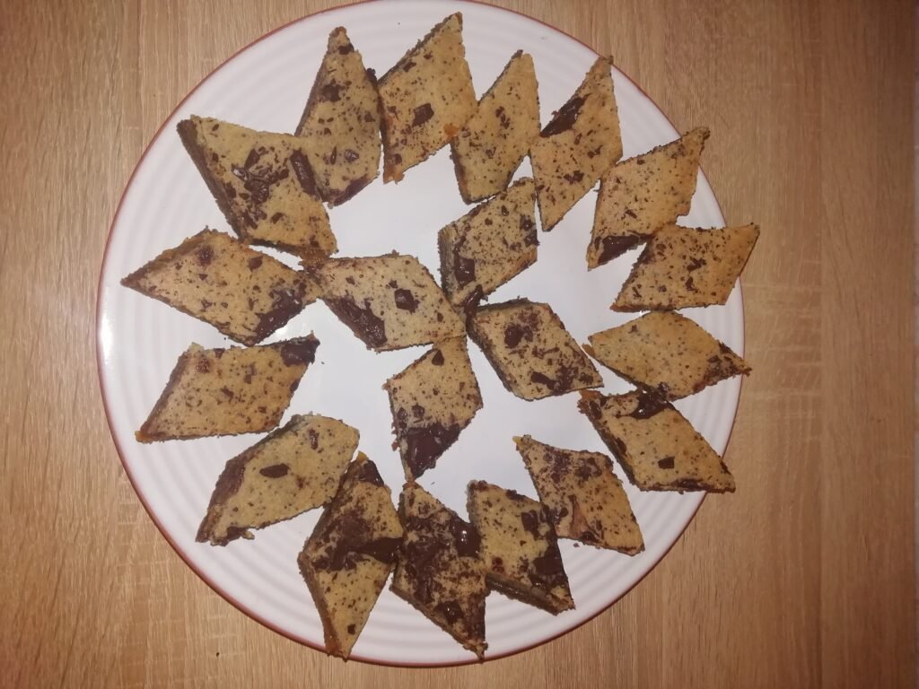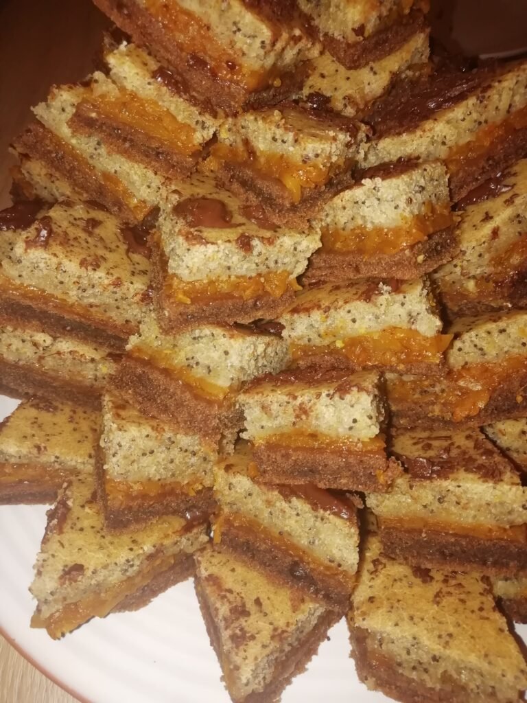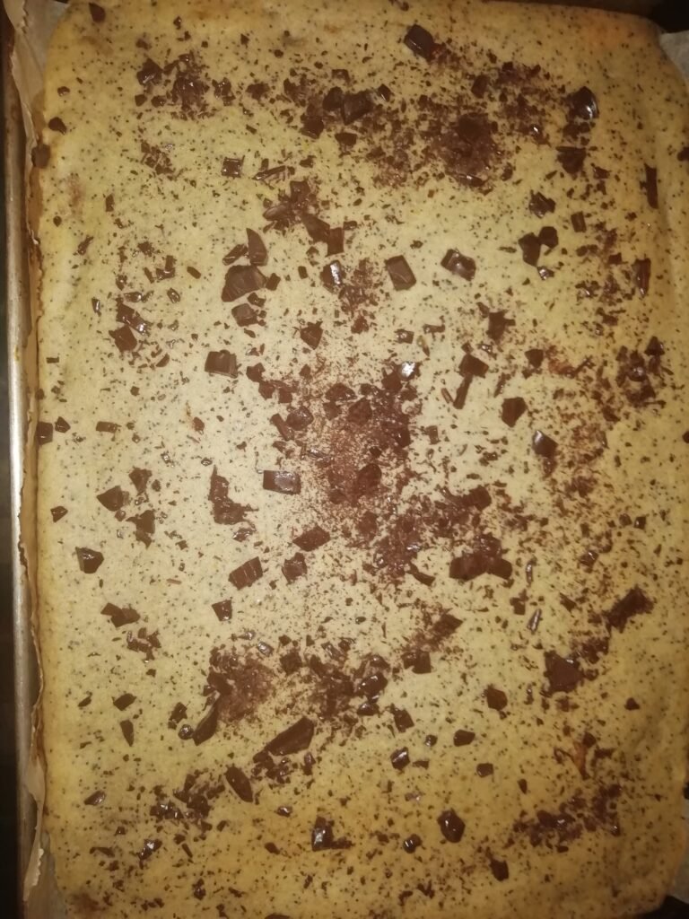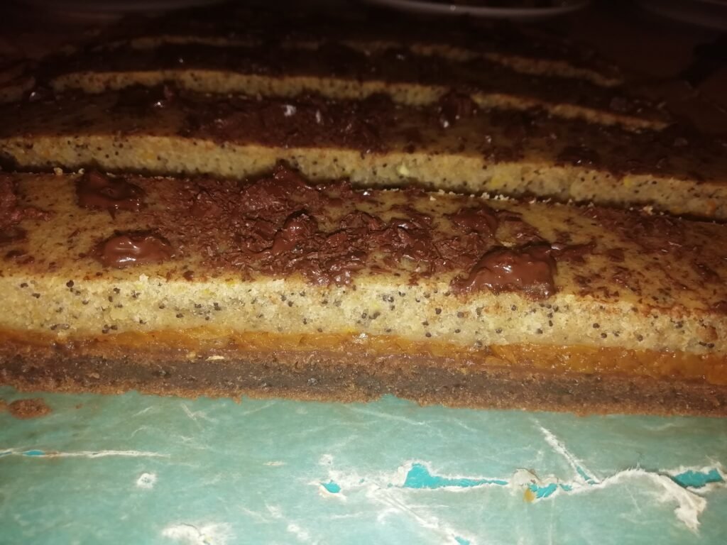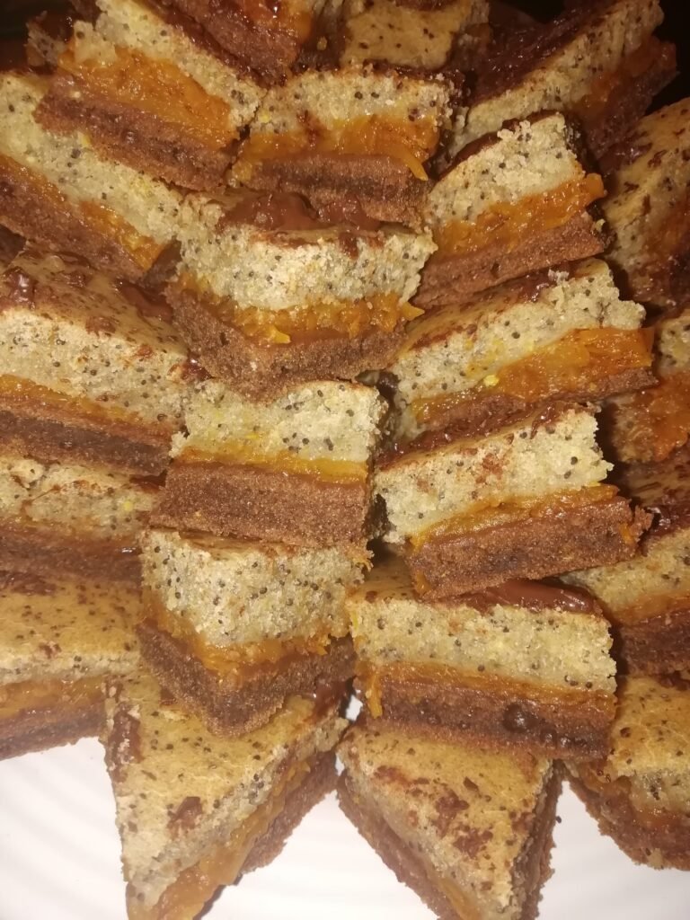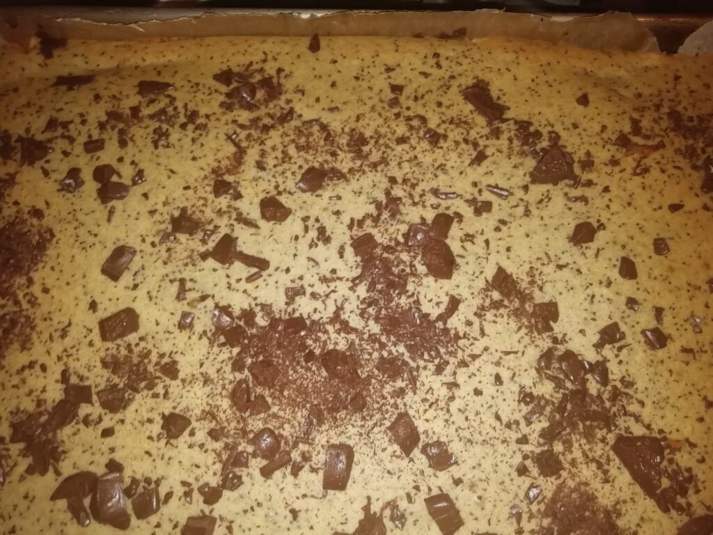 Cum am pregătit compoziția pentru blat: Am amestecat făina cu praful de copt nestins, am presărat un praf de sare și apoi am adăugat: apa minerală, uleiul, îndulcitorul, esența, coaja de portocale răzuită fin. Am mixat compoziția câteva secunde, apoi am împărțit-o ochiometric în două: în jumătate din compoziție am adăugat macul iar în cealaltă jumătate am încorporat pudra de roșcove. Am răsturnat și distribuit uniform, compoziția maro (cea cu care conține pudra de roșcove) într-o tavă tapetata cu hârtie de copt și am lăsat- o la copt cca. 20-25 minute la 200 grade, în cuptorul preîncălzit cca. 1 minut înainte; am scos tava din cuptor, am răsturnat dovleacul, l-am distribuit cât mai uniform pe toată suprafața blatului din tavă, am răsturnat și distribuit uniform, compoziția cu mac și am mai lăsat prăjitura la copt, cca 25-30 minute sau până trece testul cu scobitoarea (în funcție de cuptor). Am tocat ciocolata cu cuțitul pe un tocător și am presărat- o peste prăjitura scoasă din cuptor, pe care am lăsat- o să se răcească, apoi am porționa-o după plac.