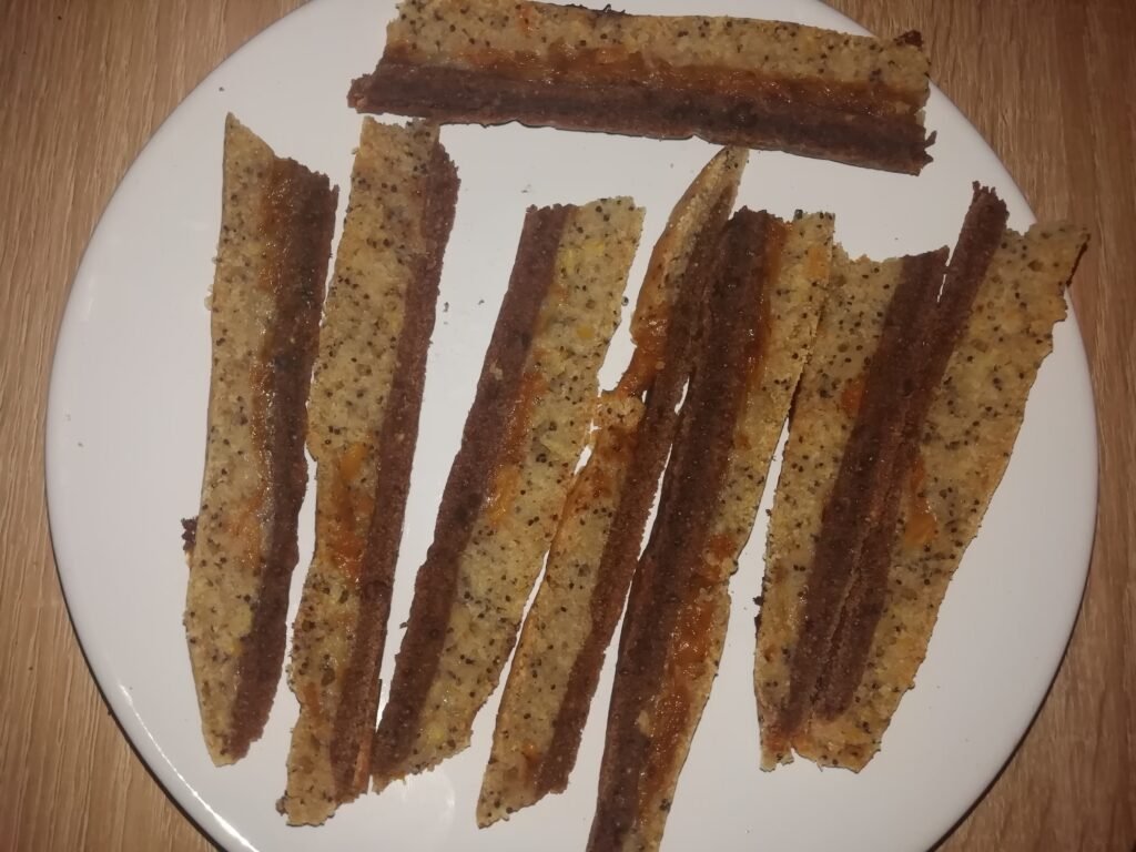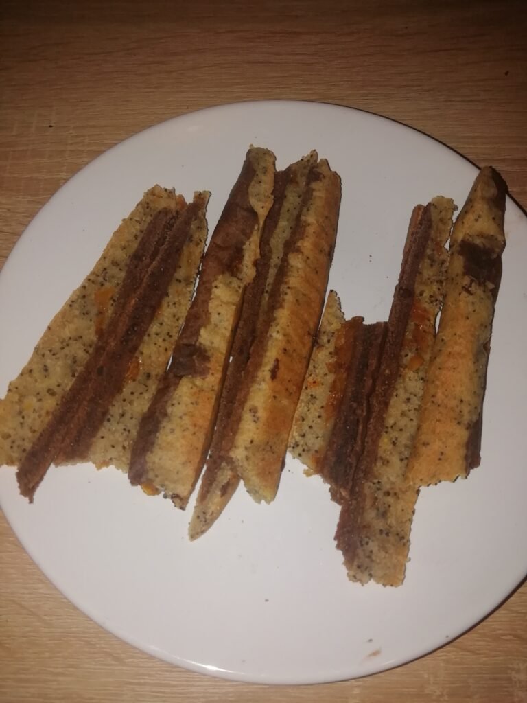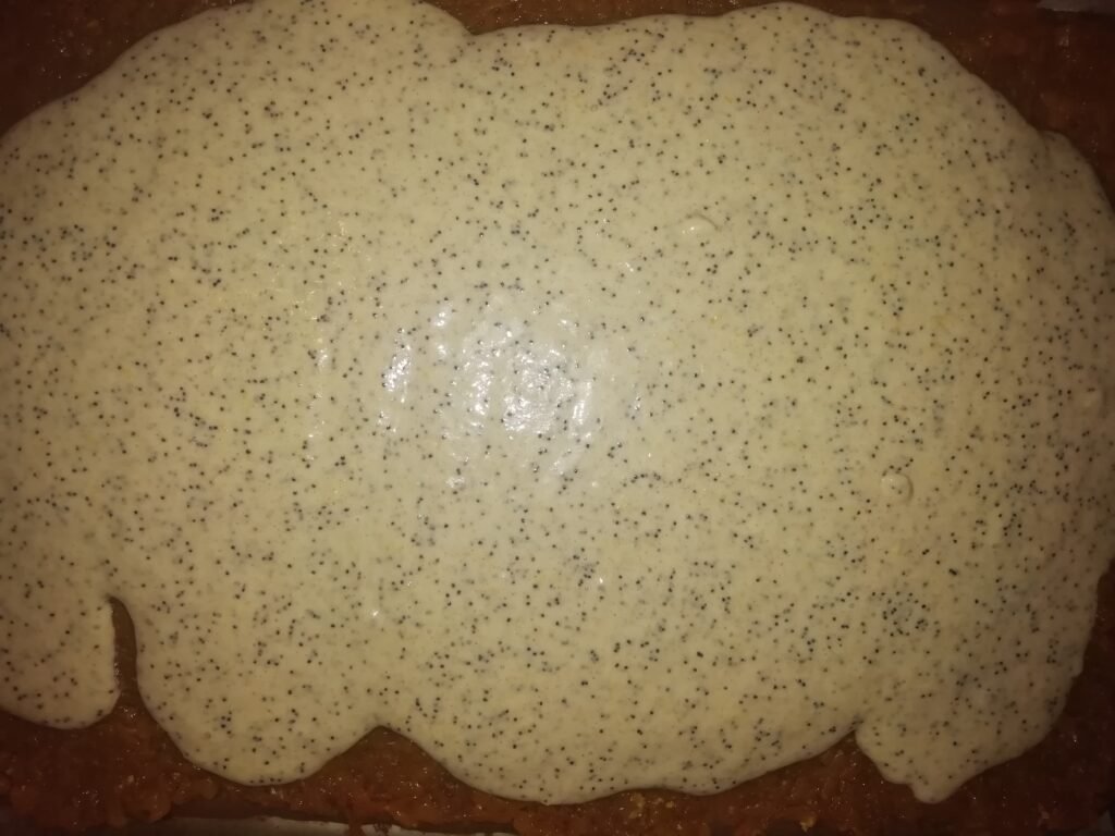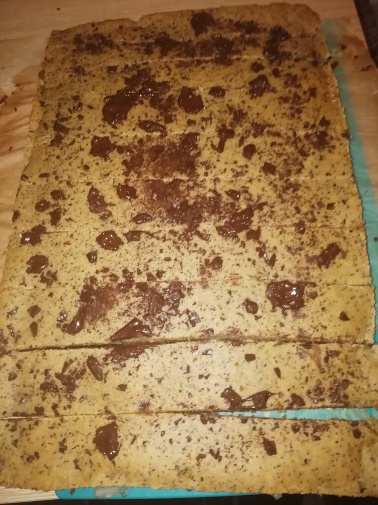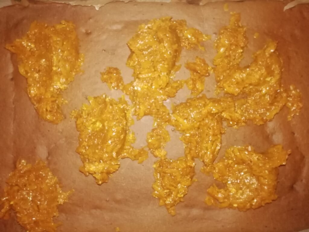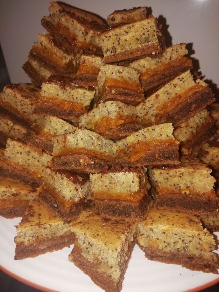 Cum am pregătit compoziția pentru blat: Am amestecat făina cu praful de copt nestins, am presărat un praf de sare și apoi am adăugat: apa minerală, uleiul, îndulcitorul, esența, coaja de portocale răzuită fin. Am mixat compoziția câteva secunde, apoi am împărțit-o ochiometric în două: în jumătate din compoziție am adăugat macul iar în cealaltă jumătate am încorporat pudra de roșcove. Am răsturnat și distribuit uniform, compoziția maro (cea cu care conține pudra de roșcove) într-o tavă tapetata cu hârtie de copt și am lăsat- o la copt cca. 20-25 minute la 200 grade, în cuptorul preîncălzit cca. 1 minut înainte; am scos tava din cuptor, am răsturnat dovleacul, l-am distribuit cât mai uniform pe toată suprafața blatului din tavă, am răsturnat și distribuit uniform, compoziția cu mac și am mai lăsat prăjitura la copt, cca 25-30 minute sau până trece testul cu scobitoarea (în funcție de cuptor). Am tocat ciocolata cu cuțitul pe un tocător și am presărat- o peste prăjitura scoasă din cuptor, pe care am lăsat- o să se răcească, apoi am porționa-o după plac.