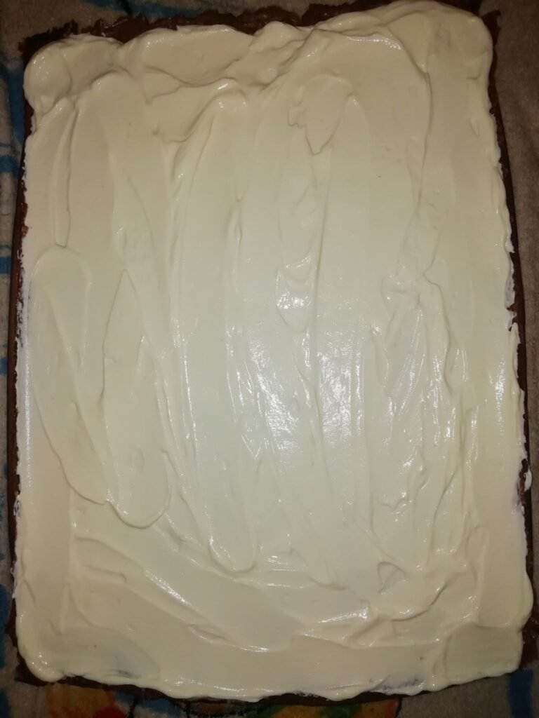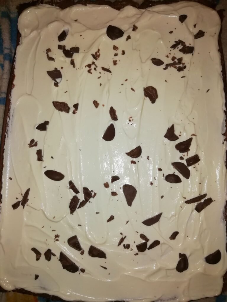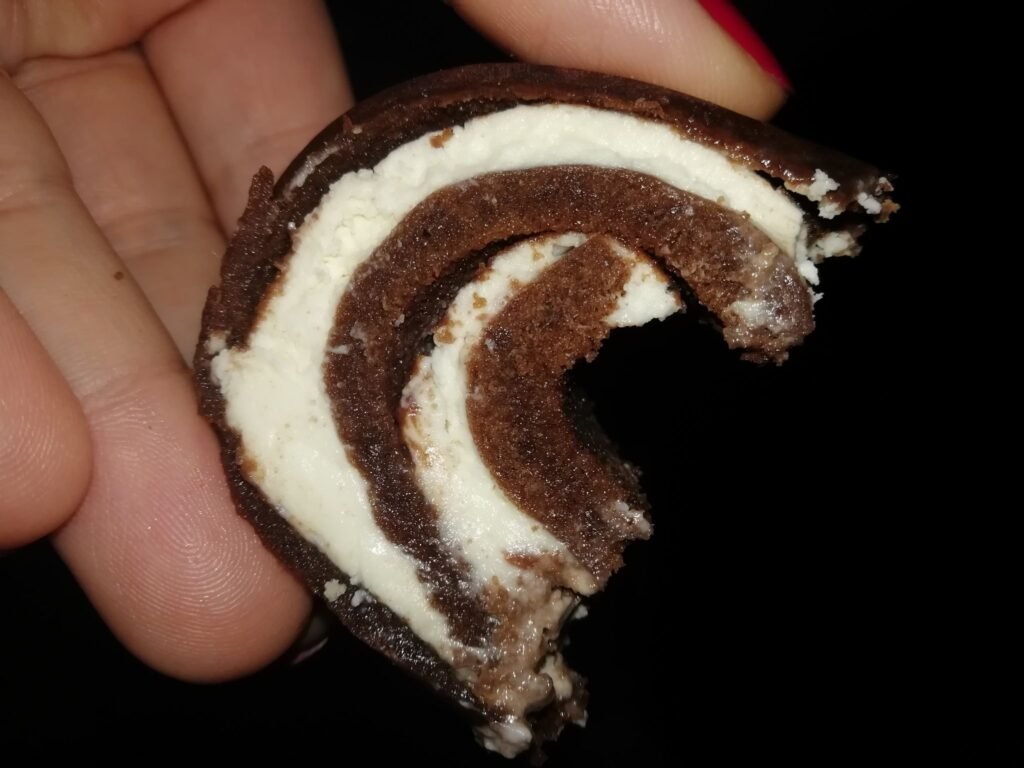 Crema cu vanilie din branzeturi: am mixat cele 2 tipuri de branza impreuna cu indulcitorul, am adaugat cateva picaturi de esenta de vanilie si am distribuit uniform crema peste foaia de rulada. Am presarat apoi cateva bucati de ciocolata si am rulat.