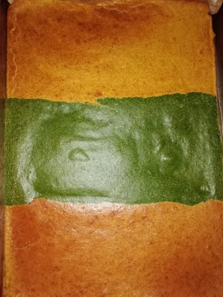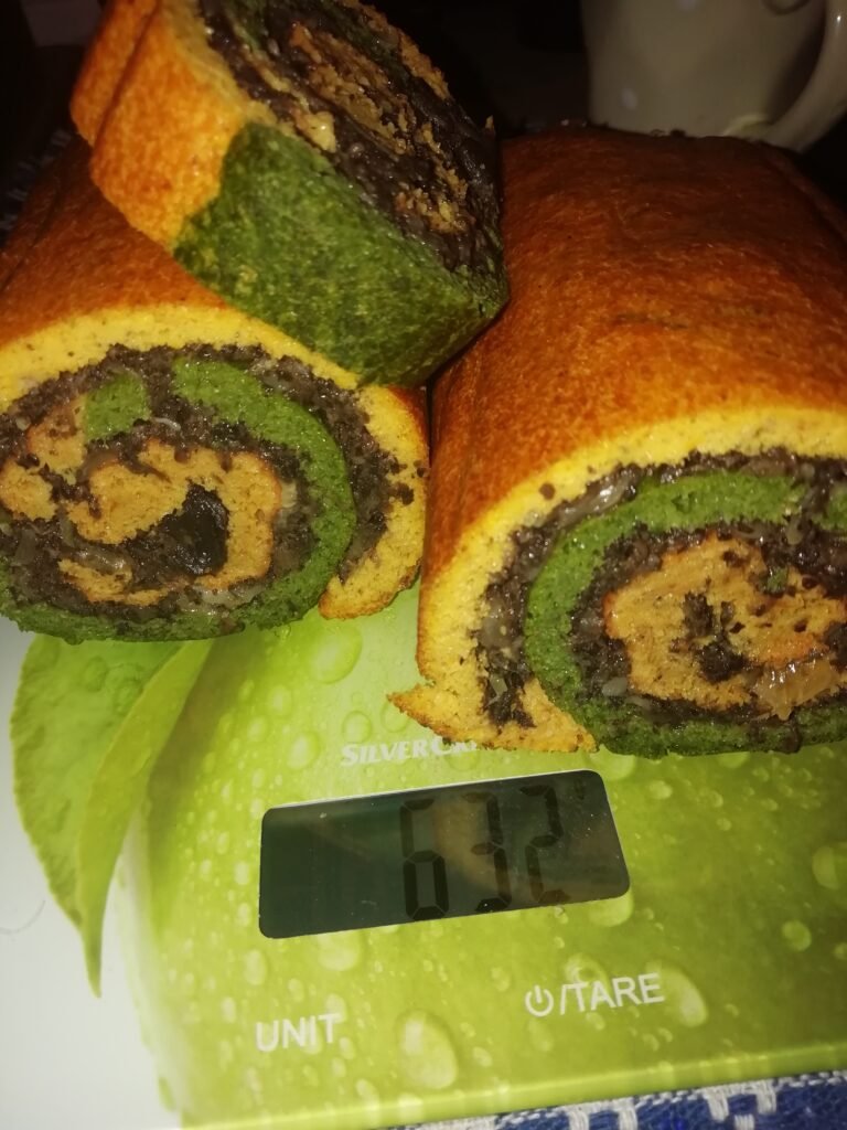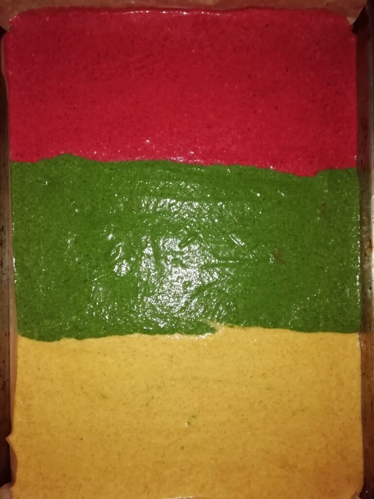 Am pregătit 6 boluri: am pus cate 2 albușuri in cate 1 bol si le-am mixat spumă cu un praf de sare. În alte 3 boluri am mixat pe rând: 2 gălbenușuri împreună cu 10 g smântână, 20 g ulei și spanacul fiert , scurs bine; apoi, alte 2 gălbenușuri împreună cu 10 g smântână, 20 g ulei și morcovul fiert si am mixat; apoi, ultimele 2 gălbenușuri împreună cu 10 g smântână, 20 g ulei și sfeclă crudă rasă fin, scursă bine. Am amestecat făînă cu praful de copt și am încorporat-o în mod egal în cele 3 creme de legume (câte 1/3 în fiecare crema). Apoi peste fiecare din cele 3 creme obținute, cu ajutorul unei linguri am încorporat spumă din albușuri. Am turnat fiecare compoziție alternativ într-o tavă tapetata cu hârtie de copt și am copt blatul 20 min la 180 grade. L-am desprins de pe hârtia de copt și l-am rulat într-un prosop umed, lăsându- l la răcit la temperatura camerei, timp în care m-am ocupat de umplutură. Dată viitoare voi dubla cantitatea de sfeclă roșie folosită, eventual voi adaugă și suc de sfeclă pentru că după coacere partea de ruladă în care am folosit sfeclă să se diferențieze că intensitate a culorii de cea în care am folosit morcov, cantitate pe care o voi injumatati- desigur că astfel, va fi modificat aportul de carbohidati.