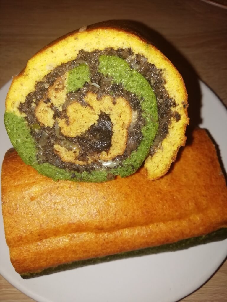 Am pregătit umplutură, astfel: am înăbușit ceapă într-o lingură de ulei și am adăugat ciupercile (crude, congelate am folosit eu pe care le-am lăsat la decongelat la temperatura camerei apoi le-am blenduit) și am adăugat 100 ml apă cât să se gătească ciupercile. Am condimentat cu sare și usturoi pisat. Am întins compoziția obținută peste blat și am rulat din nou în același prosop ușor umezit până a două zi când am servit din această ruladă, dar se poate tăia și imediat căci nu are nevoie de timp special de „odihnă”. Poftă bună!
