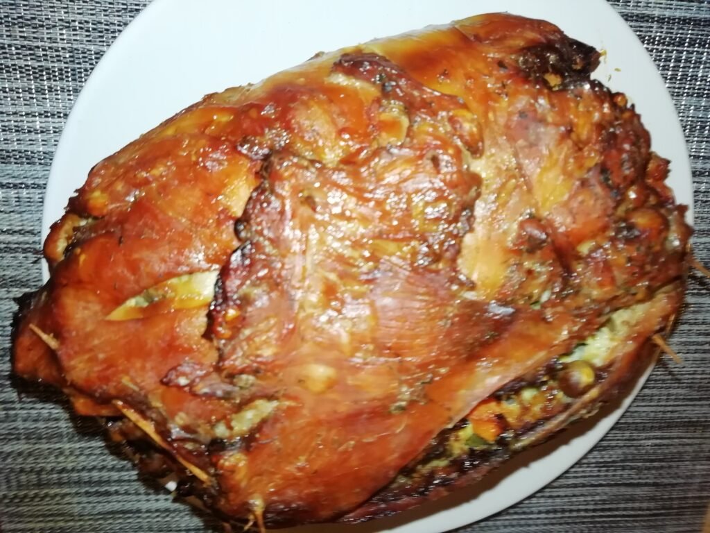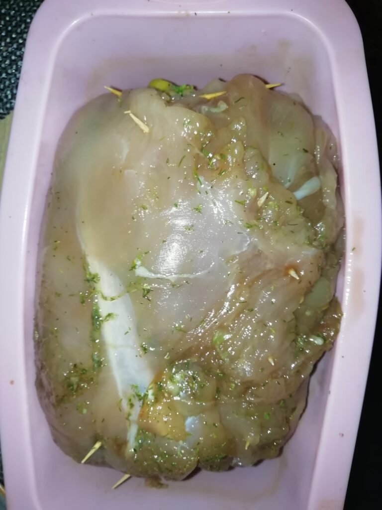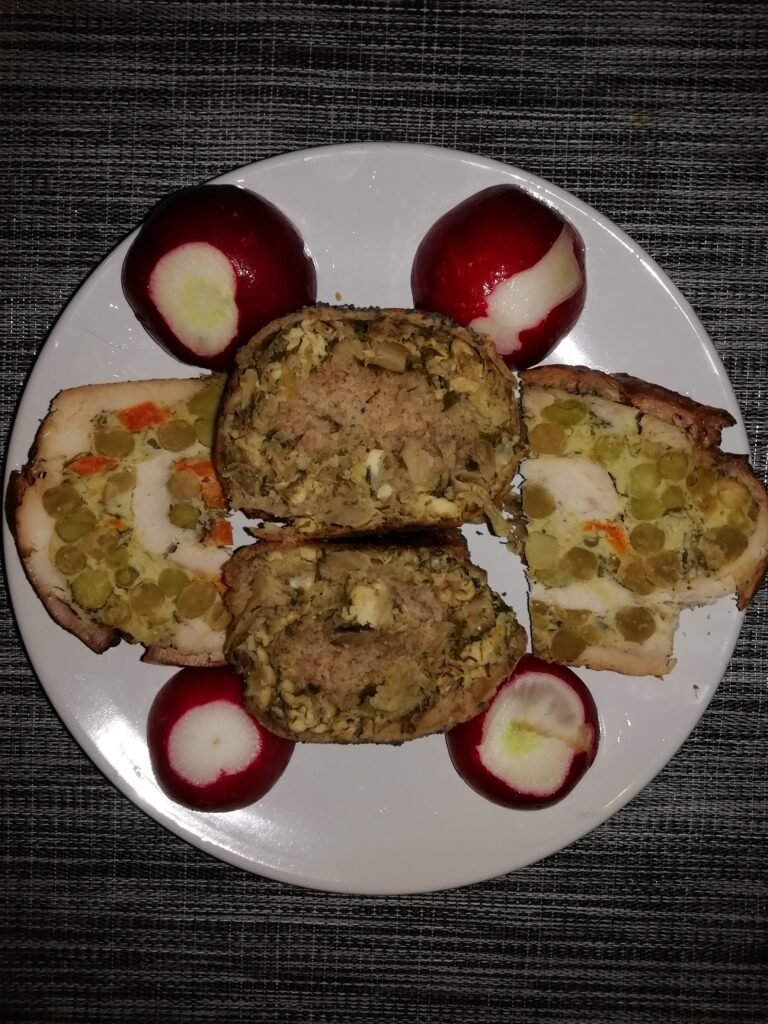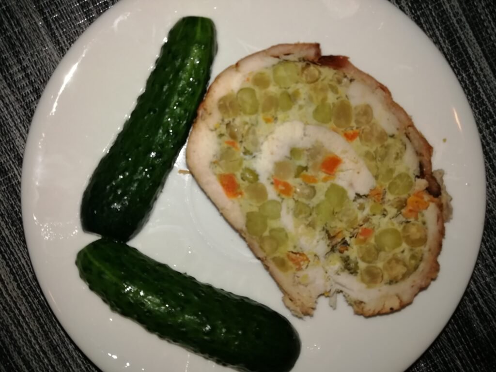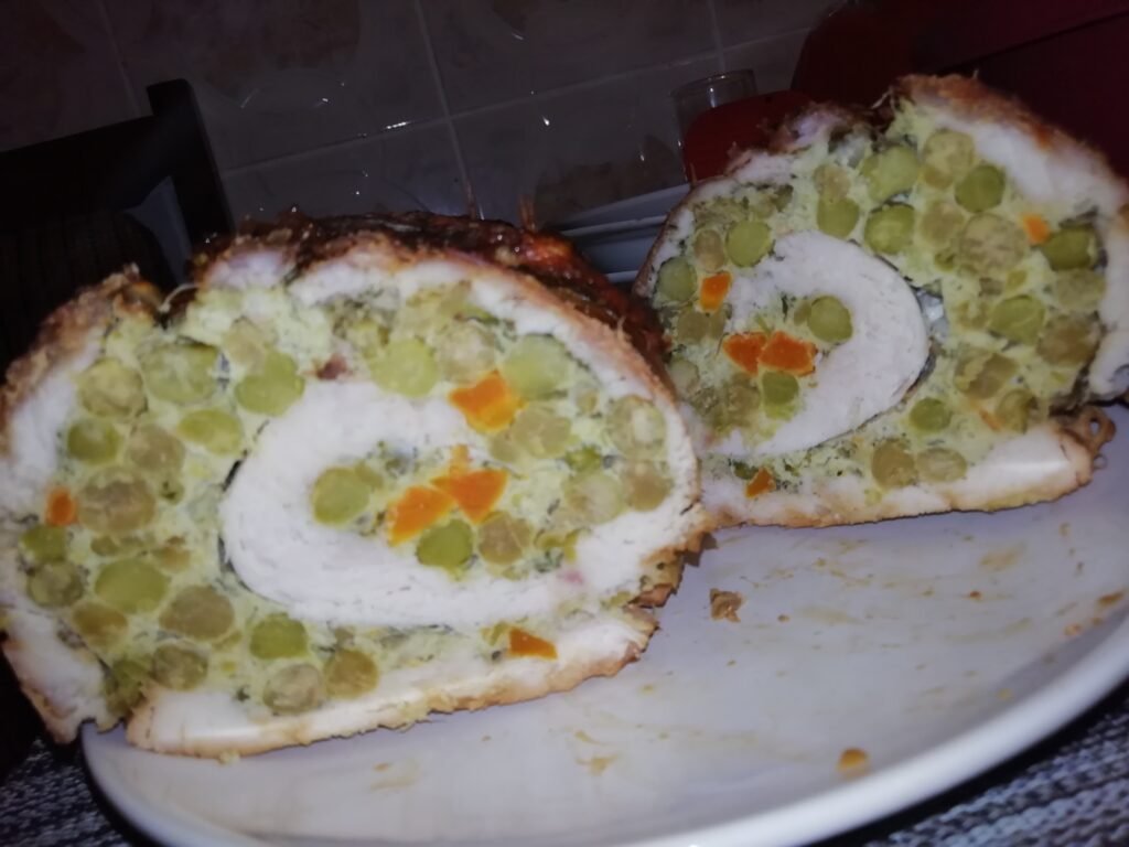 Mod de preparare: Am bătut subțire (cu grijă să nu se rupă) pieptul de pui feliat în prealabil, ca pentru șnițele și l-am condimentat cu usturoi pisat, sare, oregano și l-am lăsat la rece vreo 1-2 ore pentru a se îmbina aromele condimentelor. Cele 150 g de piept de pui tocat le-am amestecat cu mazărea și morcovul fiert- tocat cubulețe, sare și ceapa verde tocată mărunt. Am întins pieptul de pui pe blatul de lucru, suprapunându-l cam 1 cm parte peste parte, am răsturnat toată compoziția și am uniformizat-o pe toată suprafața foii de piept de pui. Am rulat strâns, am fixat foaia de piept de pui din loc în loc cu ajutorul unor scobitori, am așezat rulada într-o tavă de silicon în care am adăugat un pahar cu apă și am acoperit- o cu o folie de aluminiu (sau se poate așeza pe tavă un capac). Am lăsat ruladă în cuptor, la gătit aprox. 30 minute și apoi încă 10 min. fără folie că să se rumenească. Am lăsat-o la răcit, apoi am scos-o din tavă și am feliat-o. Poftă bună!