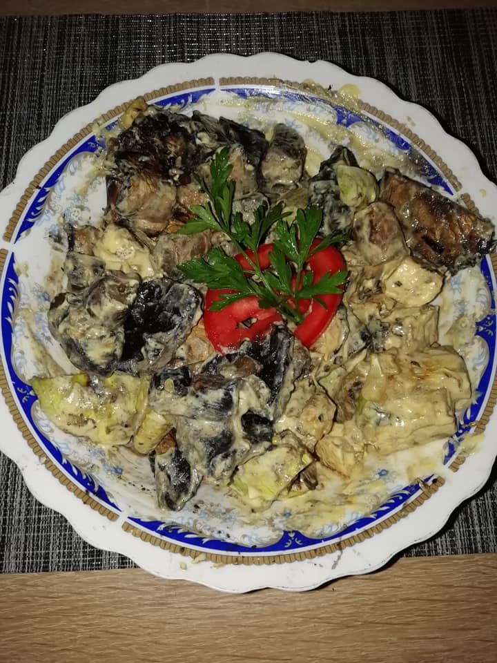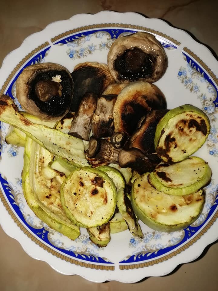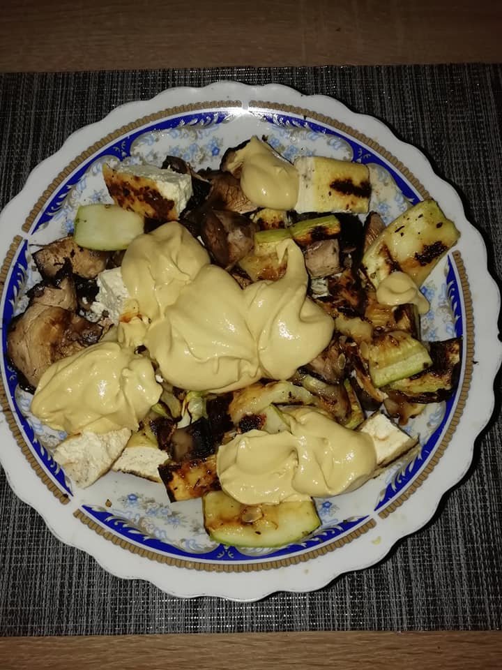 Mod de preparare: Am gătit pe grill ciupercile, dovlecelul și tofu condimentate cu usturoi granulat si un apoi le-am tocat cubulețe. Am pregătit maioneza blenduind mustarul impreuna cu tofu pasat cu furculita si am condimentat cu sare și usturoi granulat. Am amestecat totul și… pofta buna!