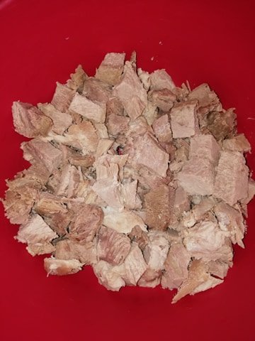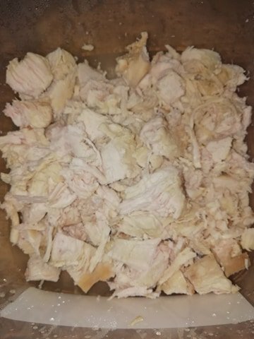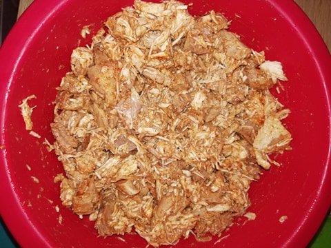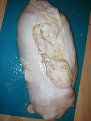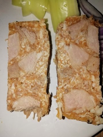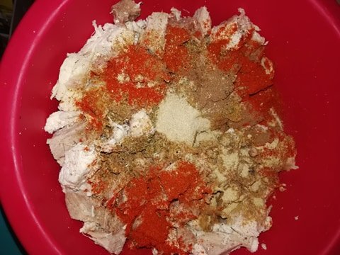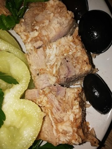 Pregătirea umpluturii: Am fiert carnea cca 30 în aproximativ 1-1,5l apă cu 2 foi dafin, o linguriță de sare și câteva boabe de piper. Când carnea a fost fiartă am oprit focul și am preparat (prin blenduire- nu îmi place să simt bucăți de usturoi pisat, dar se poate folosi un tel/ furculiță) o zeamă bine condimentatata și usturoiata din cca. 200 ml supă în care a fiert carnea și condimente după gust. Apoi am scurs carnea de zeamă în care a fiert și am tăiat-o grossier în cuburi potrivite. Am pus 20 gr gelatină la hidratat potrivit instrucțiunilor de pe pachet și după ce s-a hidratat am adăugat-o în zeamă călduță, gata condimentată, zeamă pe care am răsturnat-o apoi peste carne și am amestecat de jos în sus de 2 ,3 ori. Am lăsat umplutură deoparte și am pregătit membrană naturală pe post de înveliș al tobei.