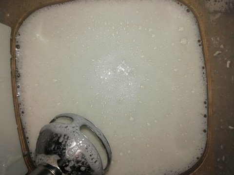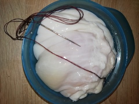 Pregătirea membranei naturale (stomacul porcului): Cât timp a fiert carnea m-am ocupat de pregătirea membranei naturale, căci fiind pentru prima oară când am pregătit o astfel de tobă naturală nu prea eram familiarizată cu pașii de lucru. Dar, cu răbdare și curiozitate m-am dat la treaba, răscolind prin amintirile din memoria mea de copil, când o asistăm pe mamaia mea la pregătirea acestui preparat. Am pus stomacul porcului în apă călduță pentru cca 5 minute apoi i-am curățit interiorul cu ajutorul buricelor de la degete, cu grijă să nu se rupă. Apoi l-am lăsat cca. 10-15 minute în oțet. Când compoziția a fost gata, pregătită am umplut membrană și apoi am cusut-o strașnic, ajutându-mă de un ac și o bucată de ață. Am pregătit o cratiță cu cca 2 l de apă pe care am pus-o la încălzit pe aragaz și când aproape să înceapă să fiarbă am dat drumul, tobei cu grijă în apă. Am fiert tobă cca 30-40 minute la foc mic; apoi am scos-o cu o paleta pe un tocător și peste ea am așezat un alt tocător și 2 greutăți (2 pungi de orez) care să preseze tobă.